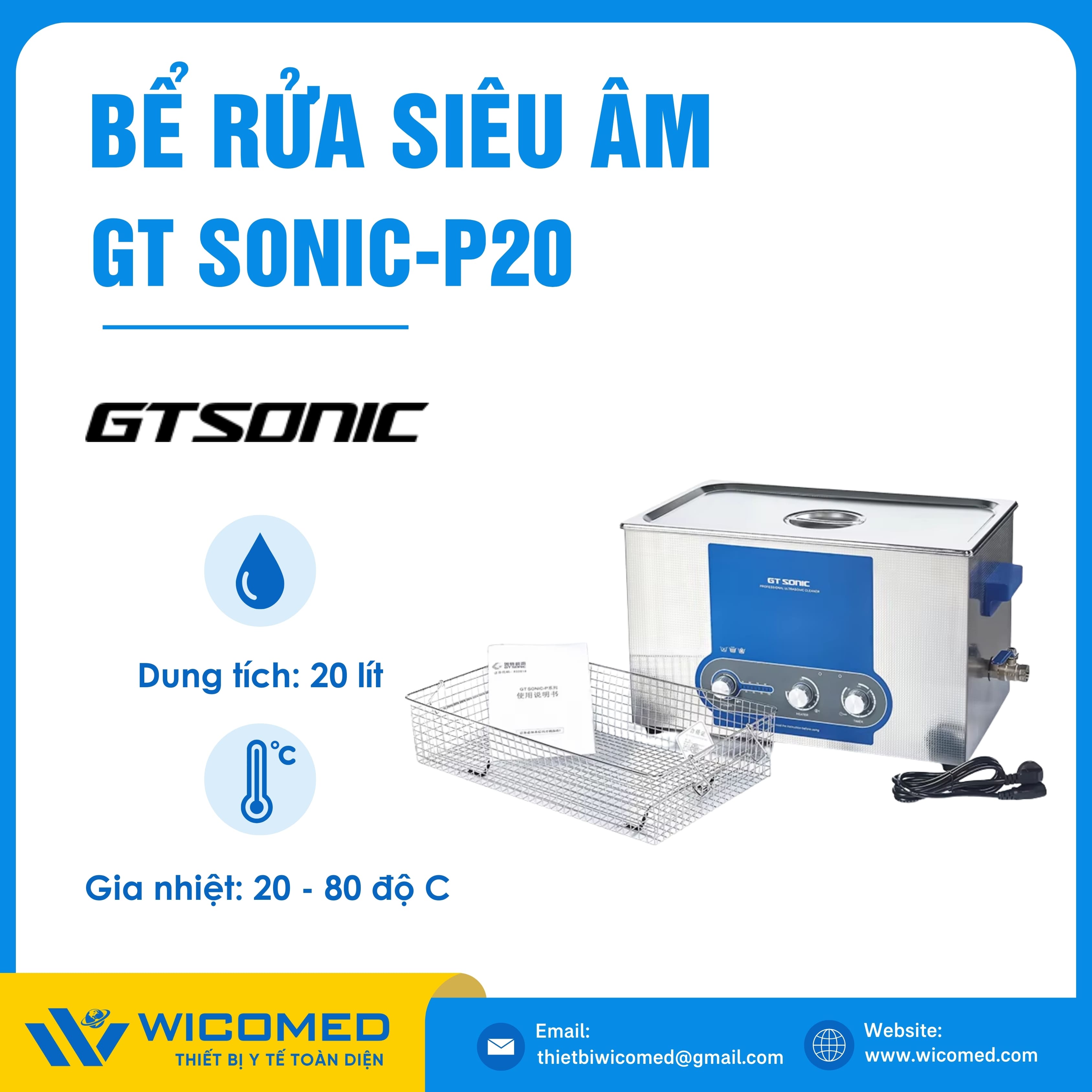 GT SONIC-P20🌟Bể rửa siêu âm có gia nhiệt với dung tích 20 Lít, tần số siêu âm 40kHz do hãng Gtsonic - Trung Quốc sản xuất. Là thiết bị tẩy rửa hoạt động bằng sóng siêu âm tần suất cao để loại bỏ các vết bẩn, mảng bám, giúp vệ sinh các vật dụng y tế, thí nghiệm,... Được nhập khẩu chính hãng bởi Wicomed. Bảo hành 12 tháng, cung cấp đầy đủ giấy tờ nhập khẩu đem đến uy tín và an tâm cho người sử dụng.