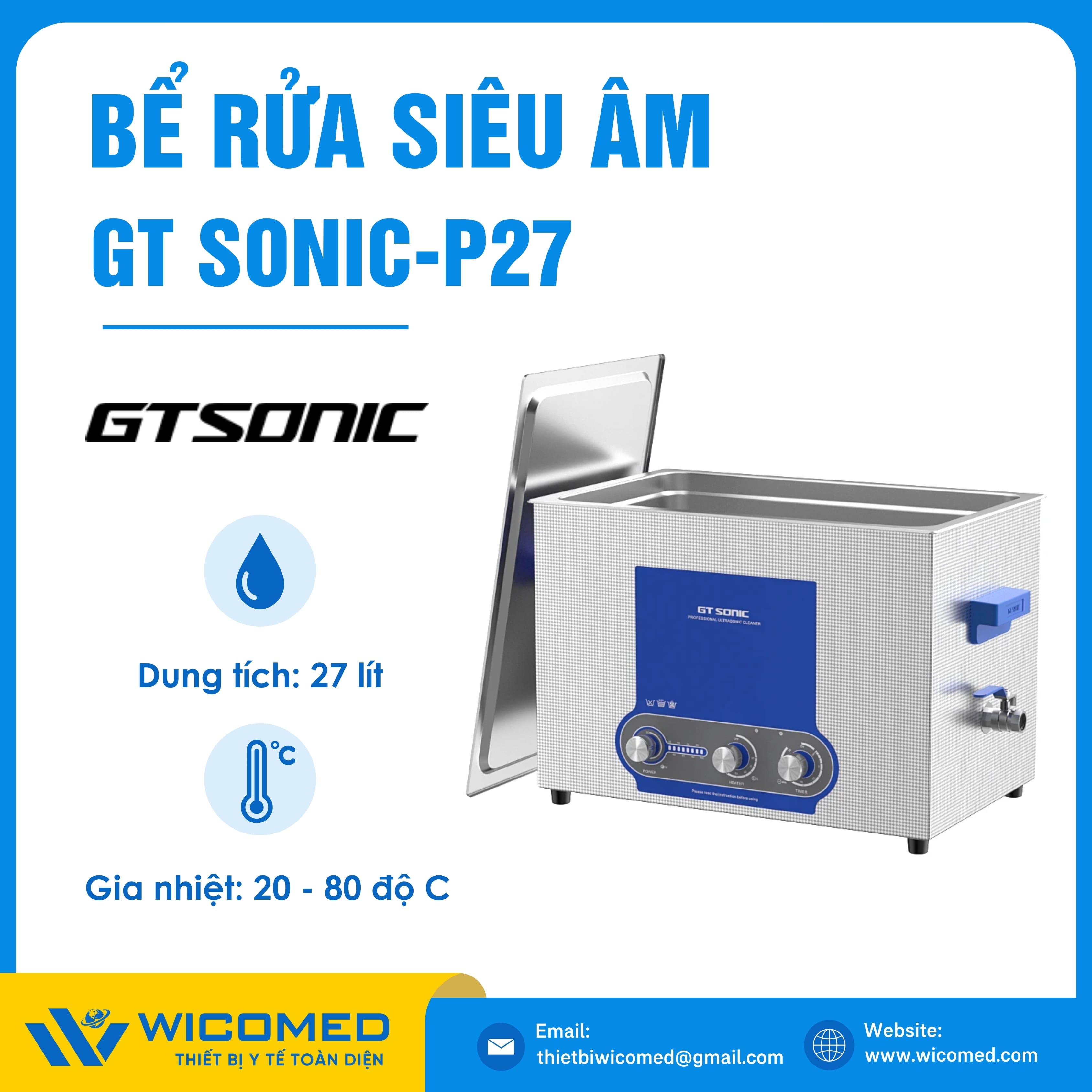 GT SONIC-P27🌟Bể rửa siêu âm có gia nhiệt với dung tích 27 Lít, tần số siêu âm 40kHz do hãng Gtsonic - Trung Quốc sản xuất. Là thiết bị tẩy rửa hoạt động bằng sóng siêu âm tần suất cao để loại bỏ các vết bẩn, mảng bám, giúp vệ sinh các vật dụng y tế, thí nghiệm,... Được nhập khẩu chính hãng bởi Wicomed. Bảo hành 12 tháng, cung cấp đầy đủ giấy tờ nhập khẩu đem đến uy tín và an tâm cho người sử dụng.