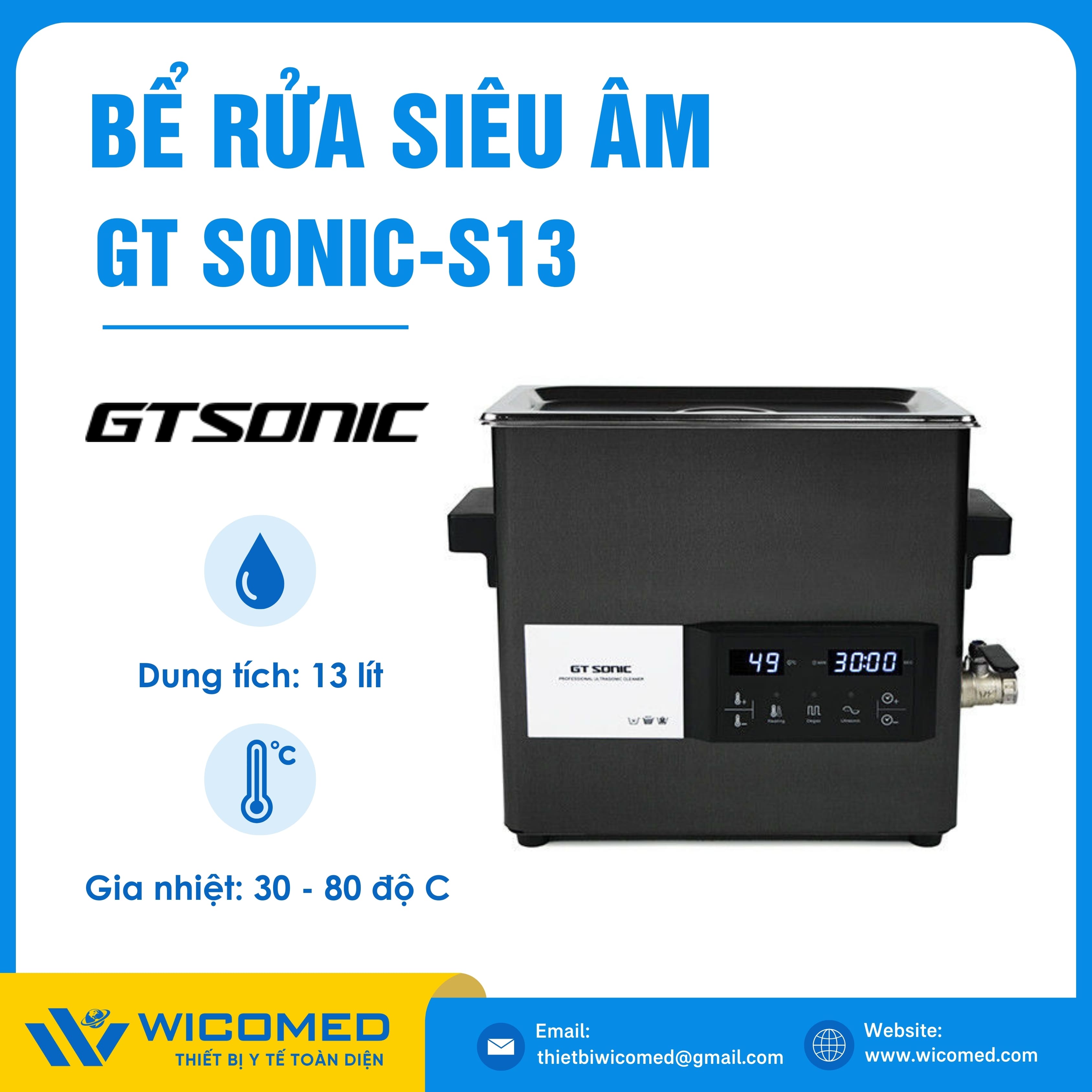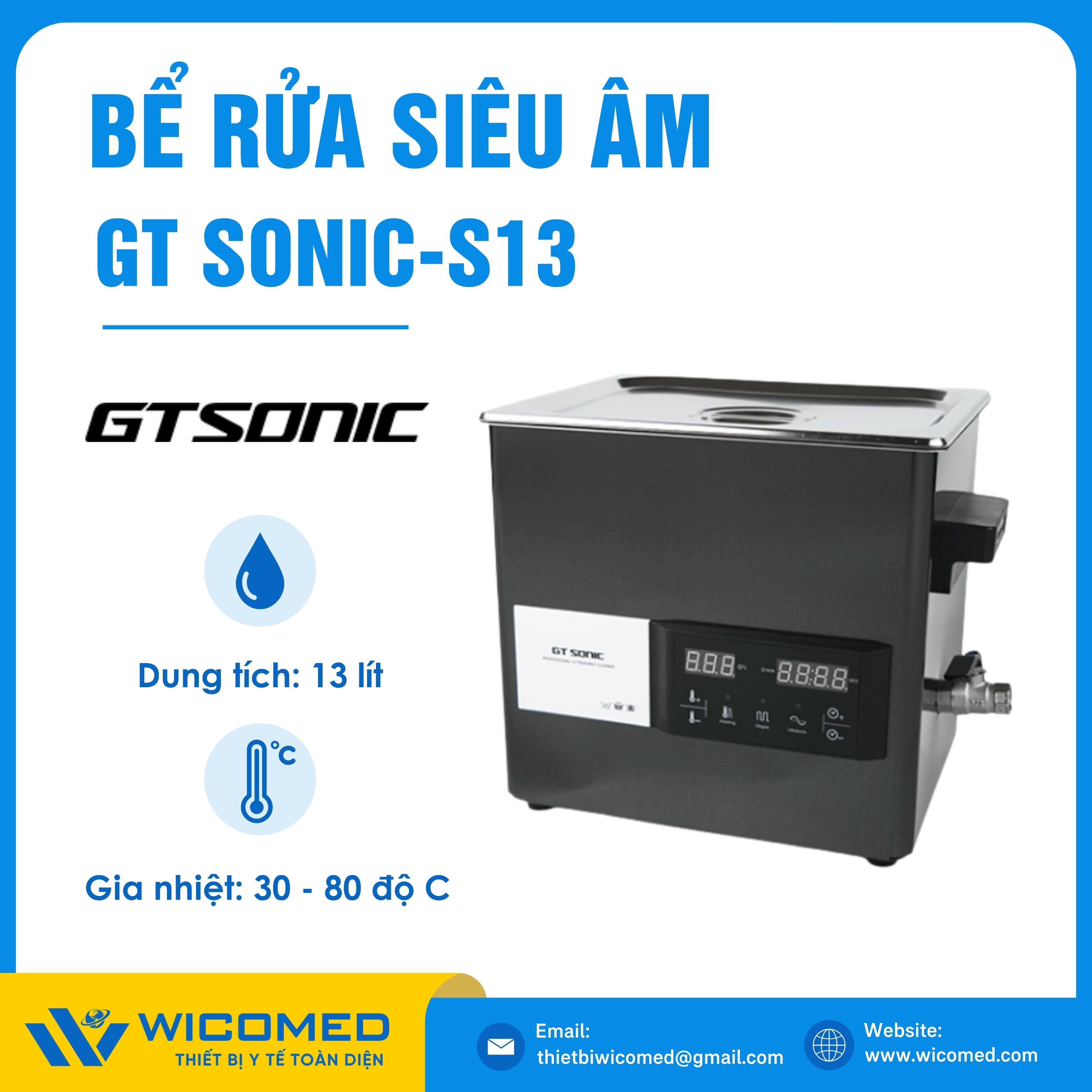GT SONIC-S13🌟Bể rửa siêu âm có gia nhiệt với dung tích 13 Lít, tần số siêu âm 40kHz do hãng Gtsonic - Trung Quốc sản xuất. Là thiết bị tẩy rửa hoạt động bằng sóng siêu âm tần suất cao để loại bỏ các vết bẩn, mảng bám, giúp vệ sinh các vật dụng y tế, thí nghiệm,... Được nhập khẩu chính hãng bởi Wicomed. Bảo hành 12 tháng, cung cấp đầy đủ giấy tờ nhập khẩu đem đến uy tín và an tâm cho người sử dụng.
