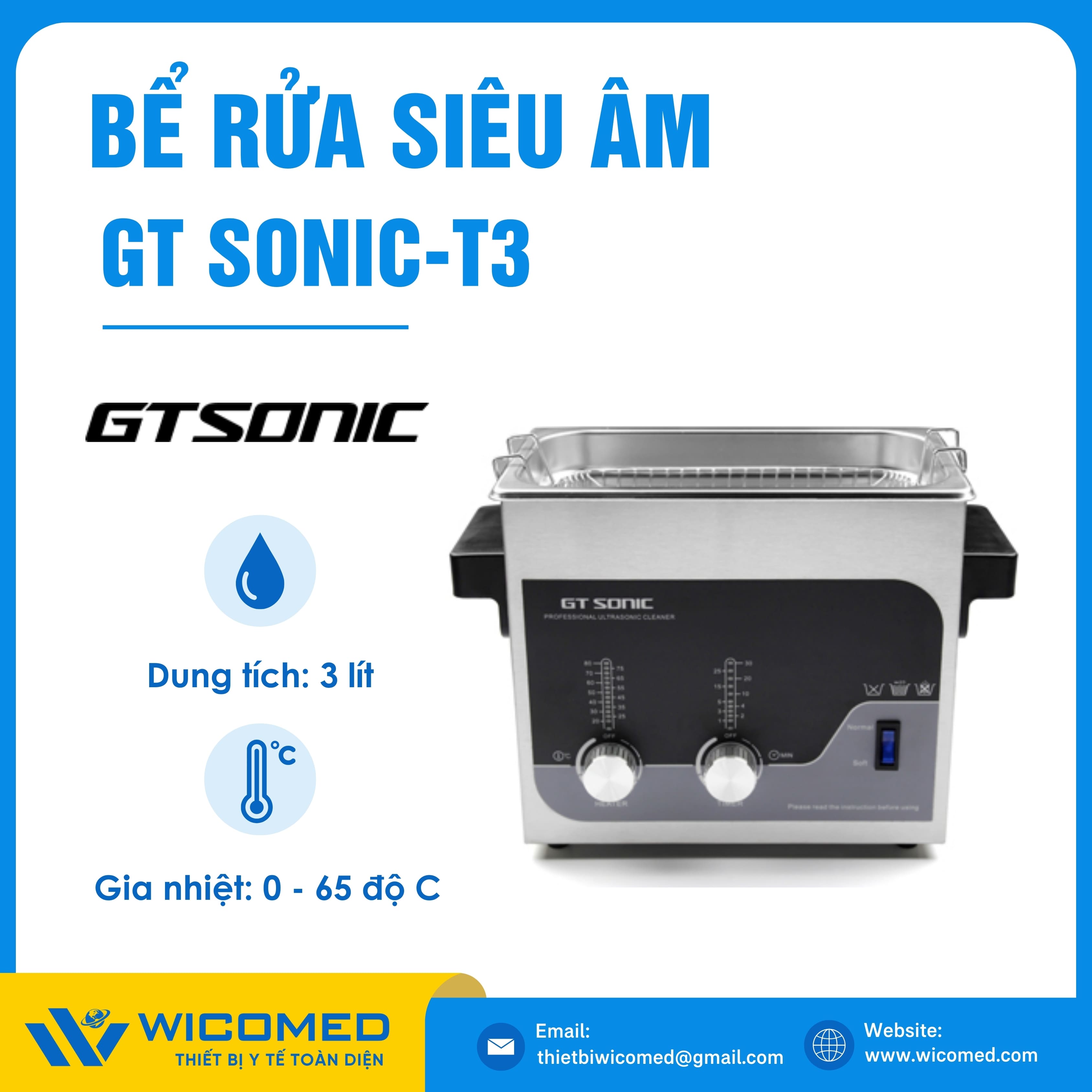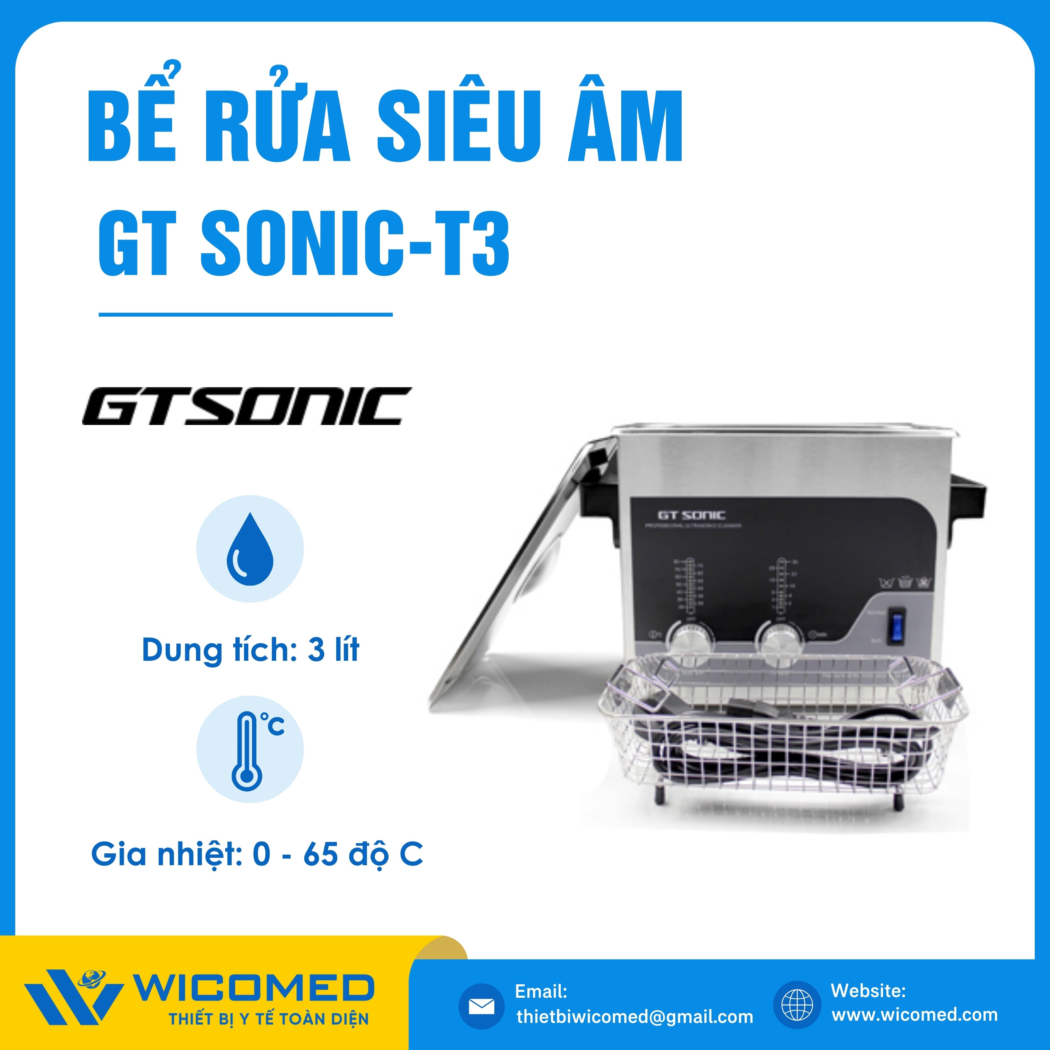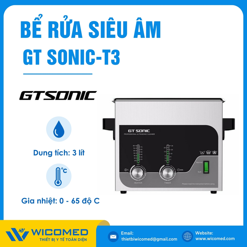 GT SONIC-T3🌟Bể rửa siêu âm với dung tích 3 Lít, gia nhiệt tối đa 80 độ C do hãng Gtsonic - Trung Quốc sản xuất. Là thiết bị tẩy rửa hoạt động bằng sóng siêu âm tần suất cao để loại bỏ các vết bẩn, mảng bám, giúp vệ sinh các vật dụng y tế, thí nghiệm,... Được nhập khẩu chính hãng bởi Wicomed. Bảo hành 12 tháng, cung cấp đầy đủ giấy tờ nhập khẩu đem đến uy tín và an tâm cho người sử dụng.