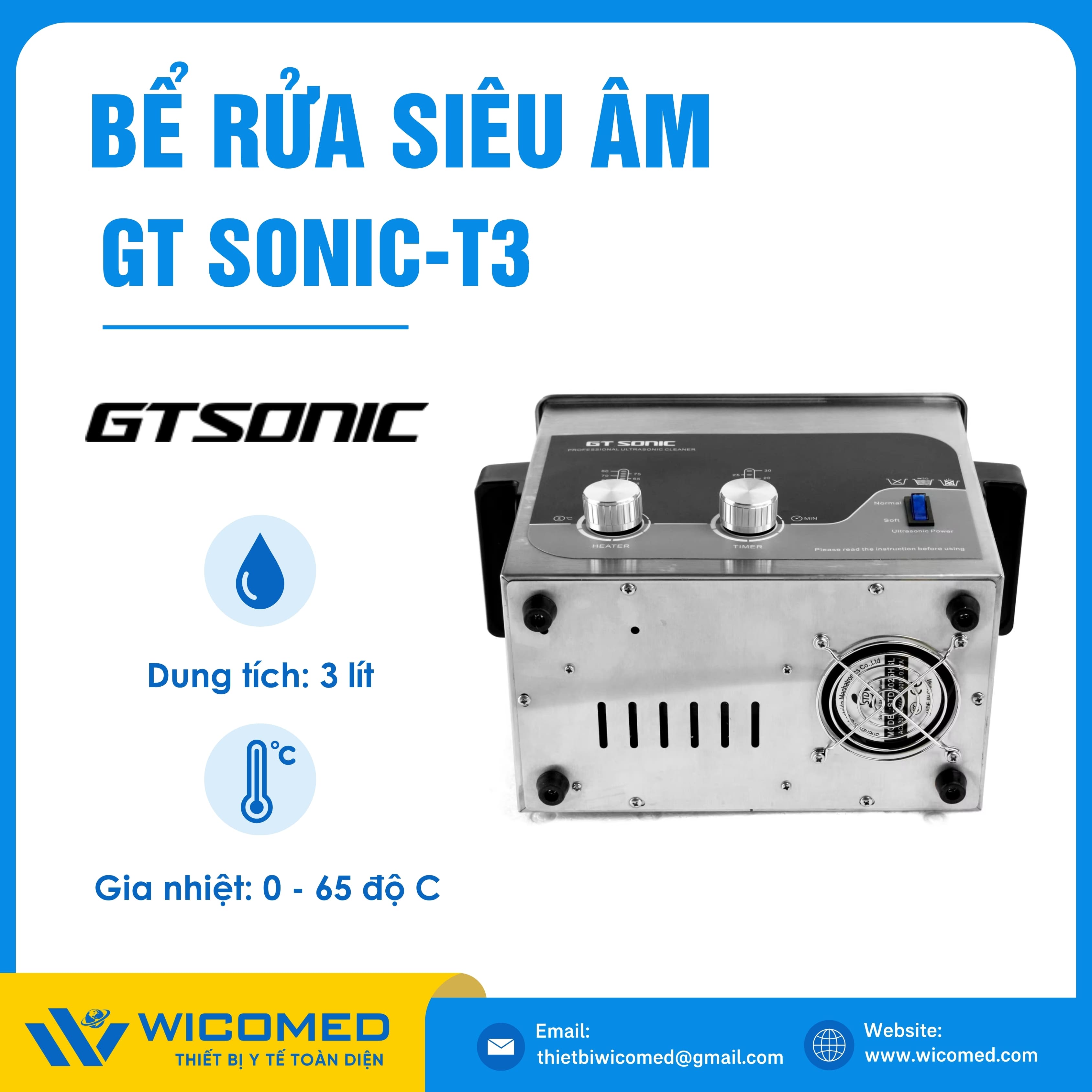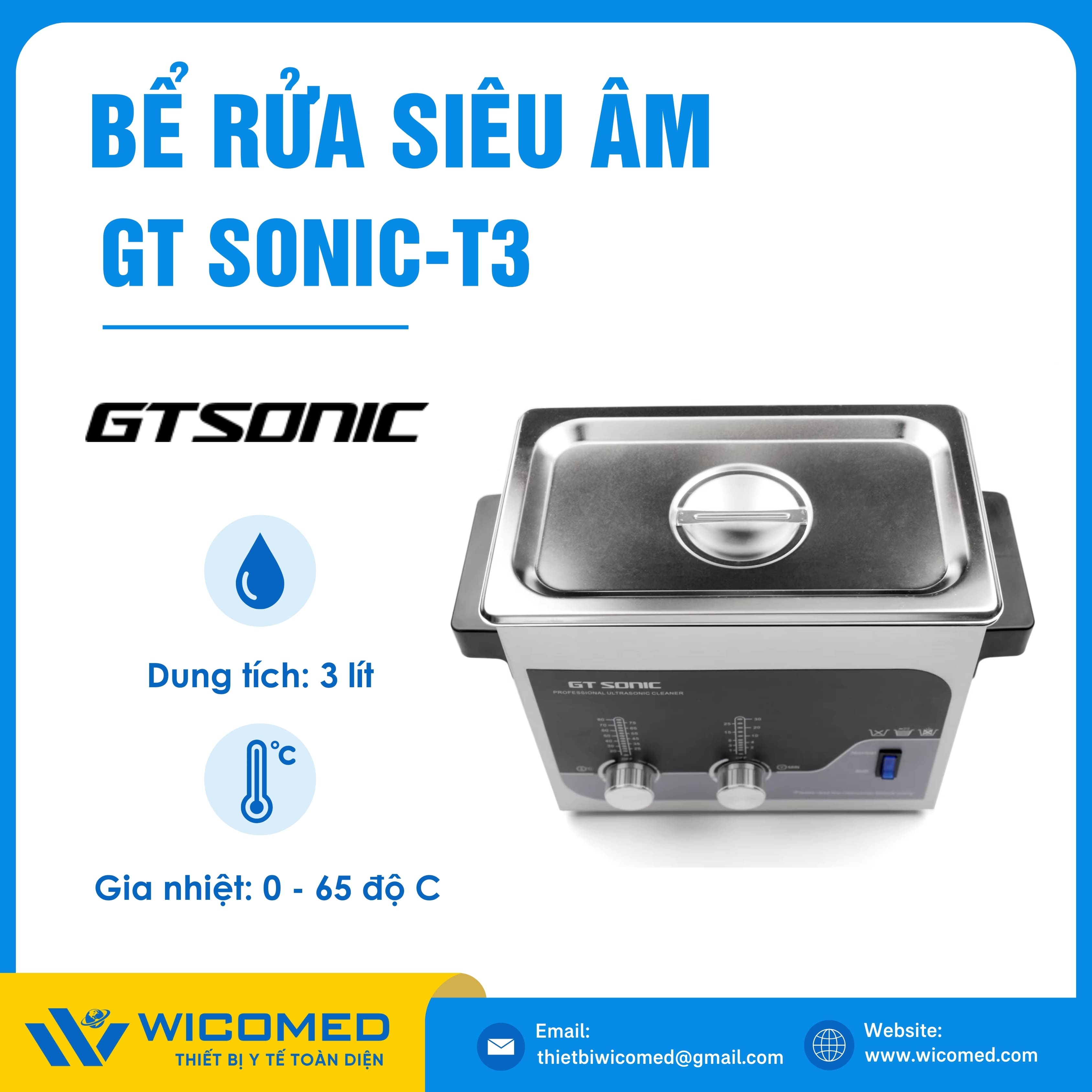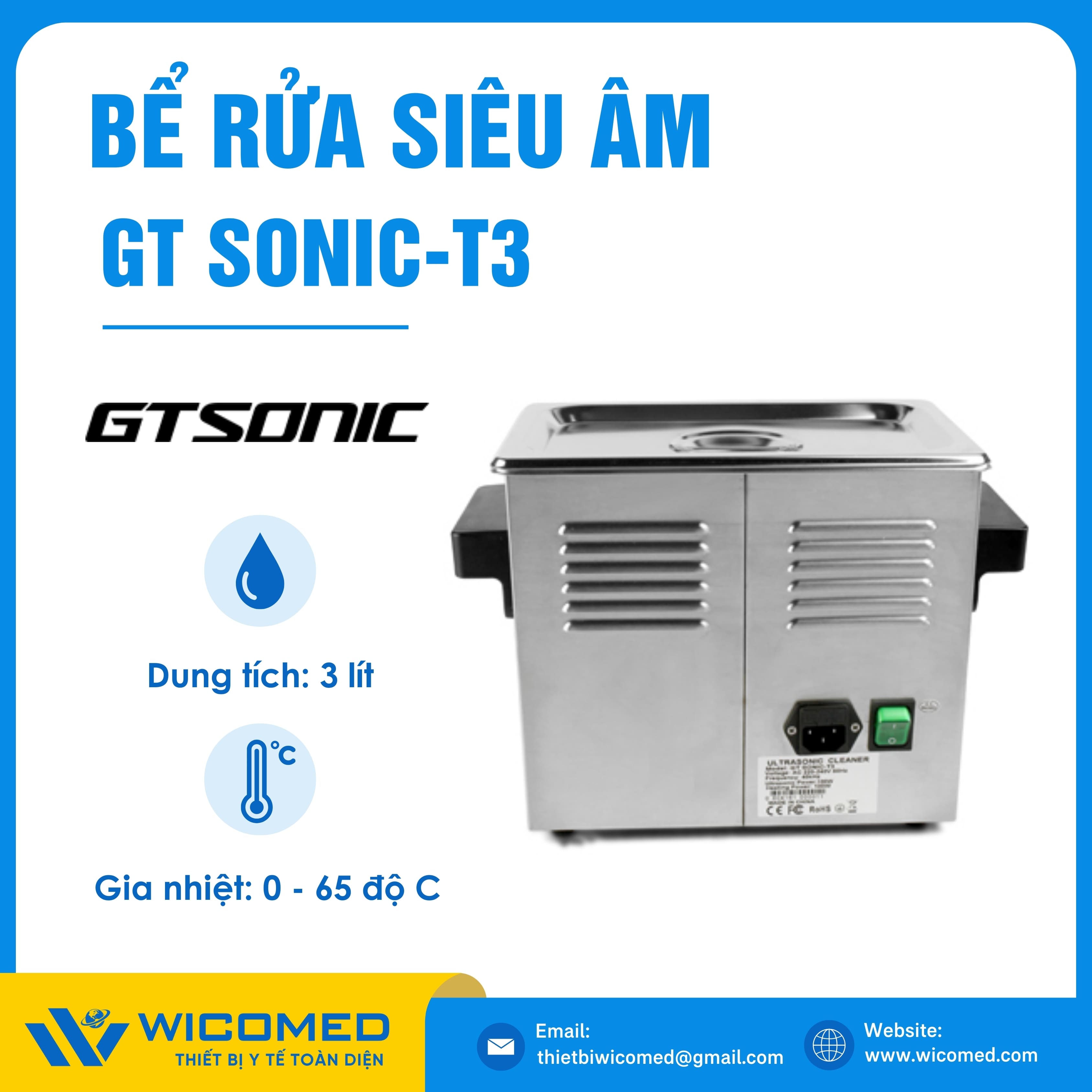 GT SONIC-T3🌟Bể rửa siêu âm với dung tích 3 Lít, gia nhiệt tối đa 80 độ C do hãng Gtsonic - Trung Quốc sản xuất. Là thiết bị tẩy rửa hoạt động bằng sóng siêu âm tần suất cao để loại bỏ các vết bẩn, mảng bám, giúp vệ sinh các vật dụng y tế, thí nghiệm,... Được nhập khẩu chính hãng bởi Wicomed. Bảo hành 12 tháng, cung cấp đầy đủ giấy tờ nhập khẩu đem đến uy tín và an tâm cho người sử dụng.