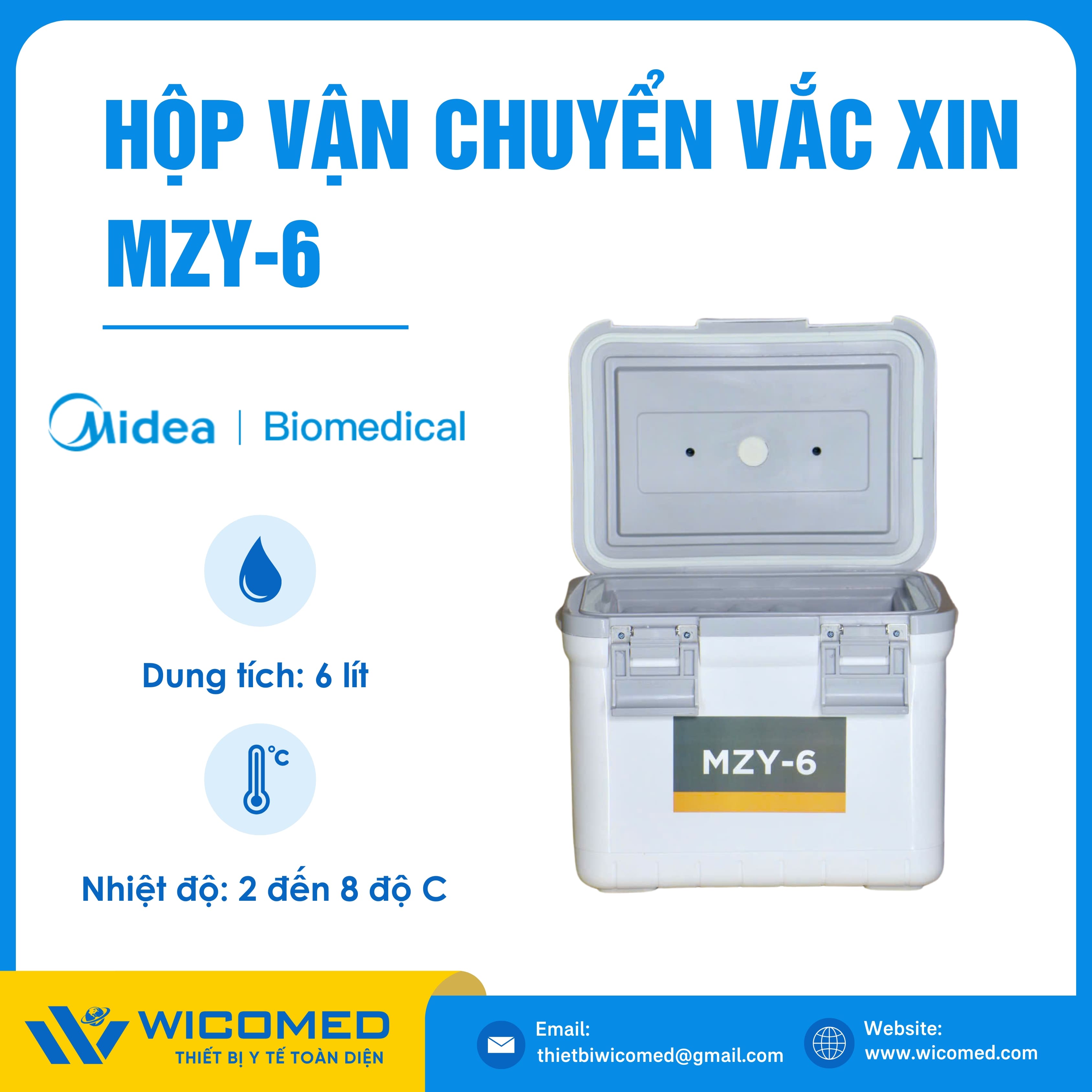 MZY-6 🌟 Hộp bảo quản-vận chuyển vắc xin, dược phẩm, sinh phẩm, hoá chất... với dung tích 6 Lít, dải nhiệt độ 2-8 độ C, và thời gian bảo quản lên tới 24h do hãng Midea - Trung Quốc sản xuất. Được nhập khẩu chính hãng bởi Wicomed. Bảo hành 12 tháng, cung cấp đầy đủ giấy tờ nhập khẩu đem đến uy tín và an tâm cho người sử dụng.