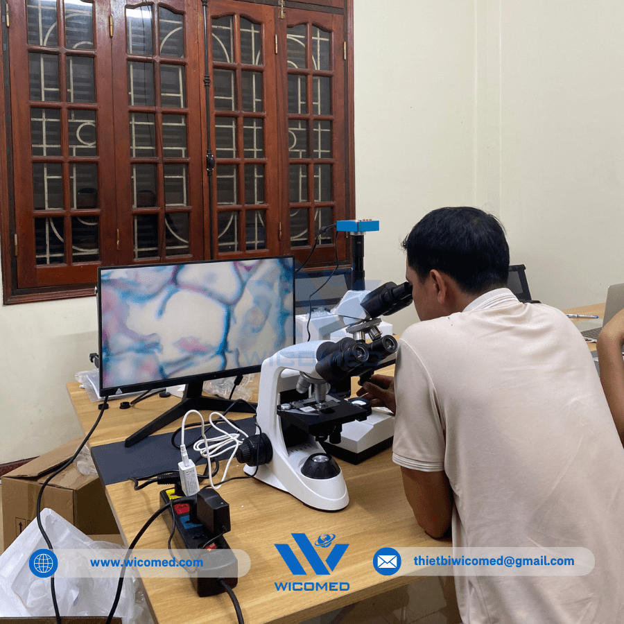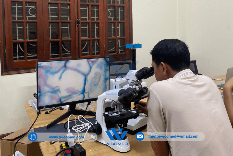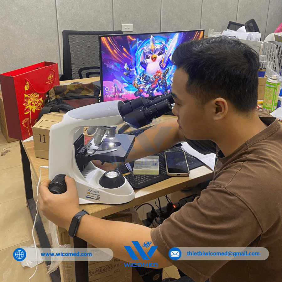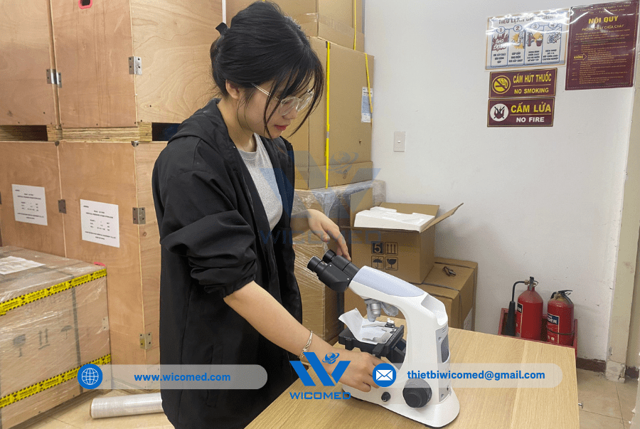 Nhân viên Wico kiểm tra kính hiển vi sinh học ICO-L1000PLi