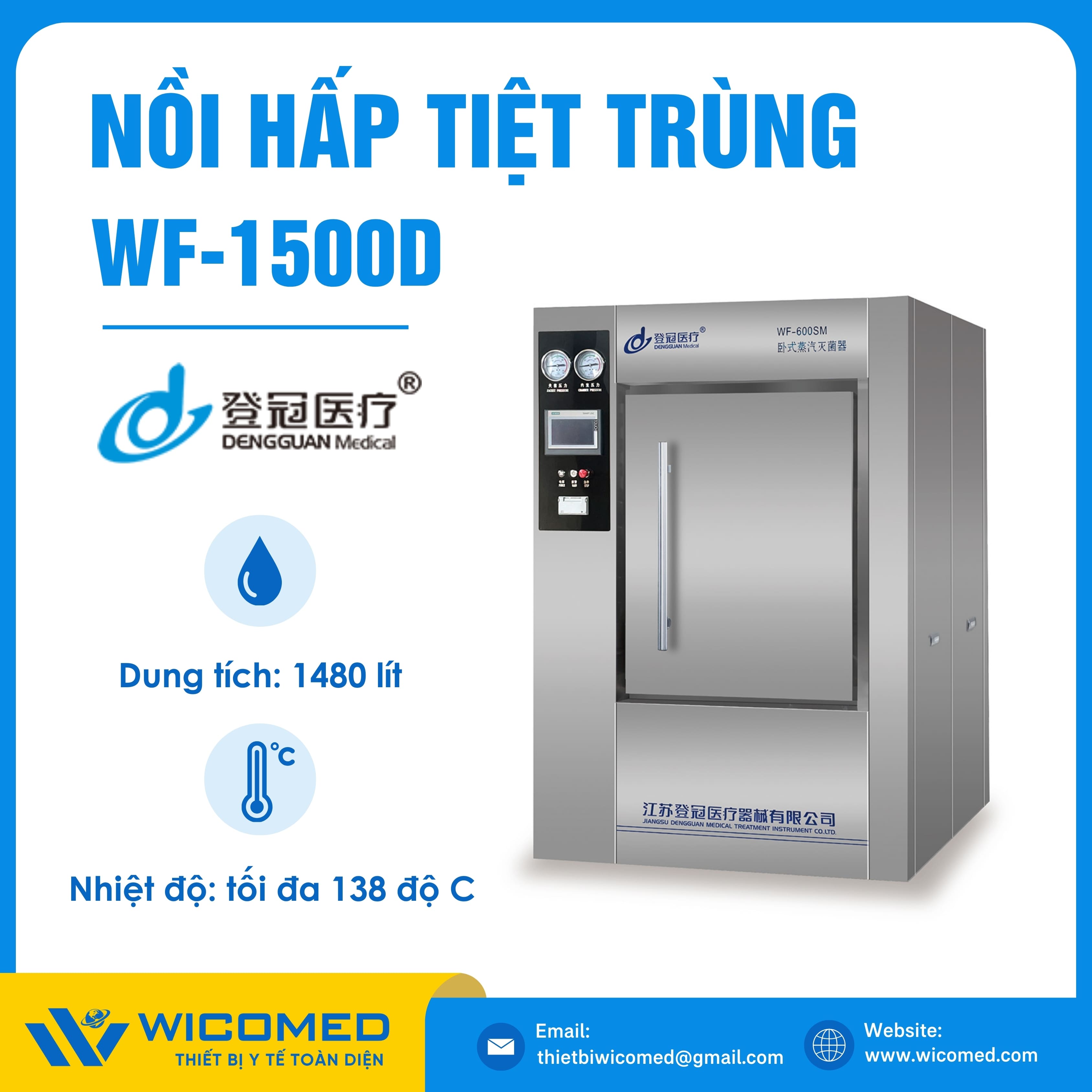 WF-1500D 🌟 Nồi hấp tiệt trùng Class N với dung tích 1480 Lít, nhiệt độ tiệt trùng tối đa lên tới 138 độ C do hãng Dengguan - Trung Quốc sản xuất. Là thiết bị khử trùng tác nhân gây truyền nhiễm trên dụng cụ, thiết bị y tế, quần áo phẫu thuật,... Ứng dụng rộng rãi trong bệnh viện, phòng khám, trạm y tế,... Được nhập khẩu chính hãng bởi Wicomed. Bảo hành 12 tháng, cung cấp đầy đủ giấy tờ nhập khẩu đem đến uy tín và an tâm cho người sử dụng.