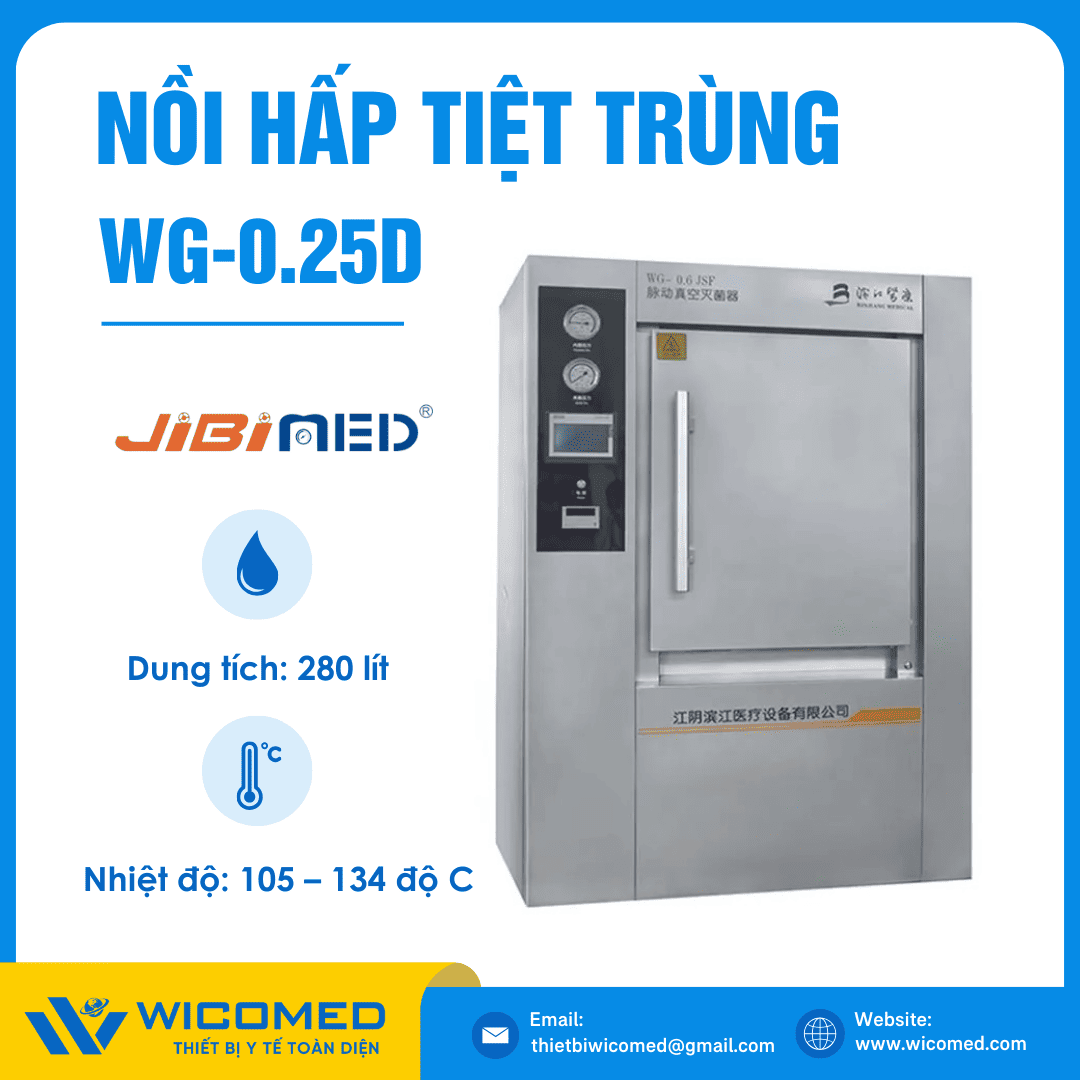 WG-0.25D⭐Nồi hấp tiệt trùng có 2 cửa và buồng hấp hình trụ chữ nhật do hãng Jibimed - Trung Quốc thiết kế chế tạo. Với dung tích 250 lít, được thiết kế và sản xuất theo các tiêu chuẩn của Trung Quốc GB150 (Bình áp suất), GB8599 (Các yêu cầu kỹ thuật với nồi hấp tự động dung tích lớn), TSG R0004 (Thông số kỹ thuật và an toàn với bình điều khiển). Đáp ứng các yêu cầu về GMP. Nhập Khẩu và Phân Phối bởi Wico Việt Nam. Cam kết 100% sản phẩm chính hãng. Bảo hành lên tới 12 tháng. Hỗ trợ giao hàng toàn quốc.