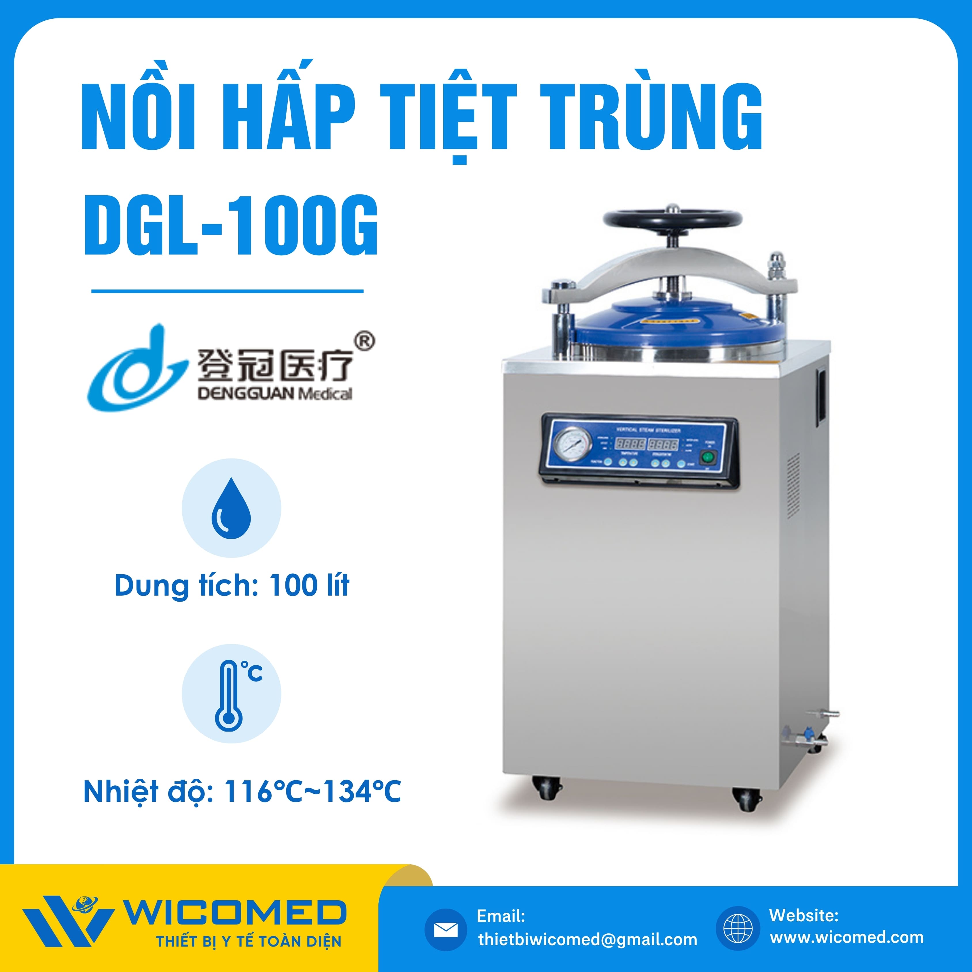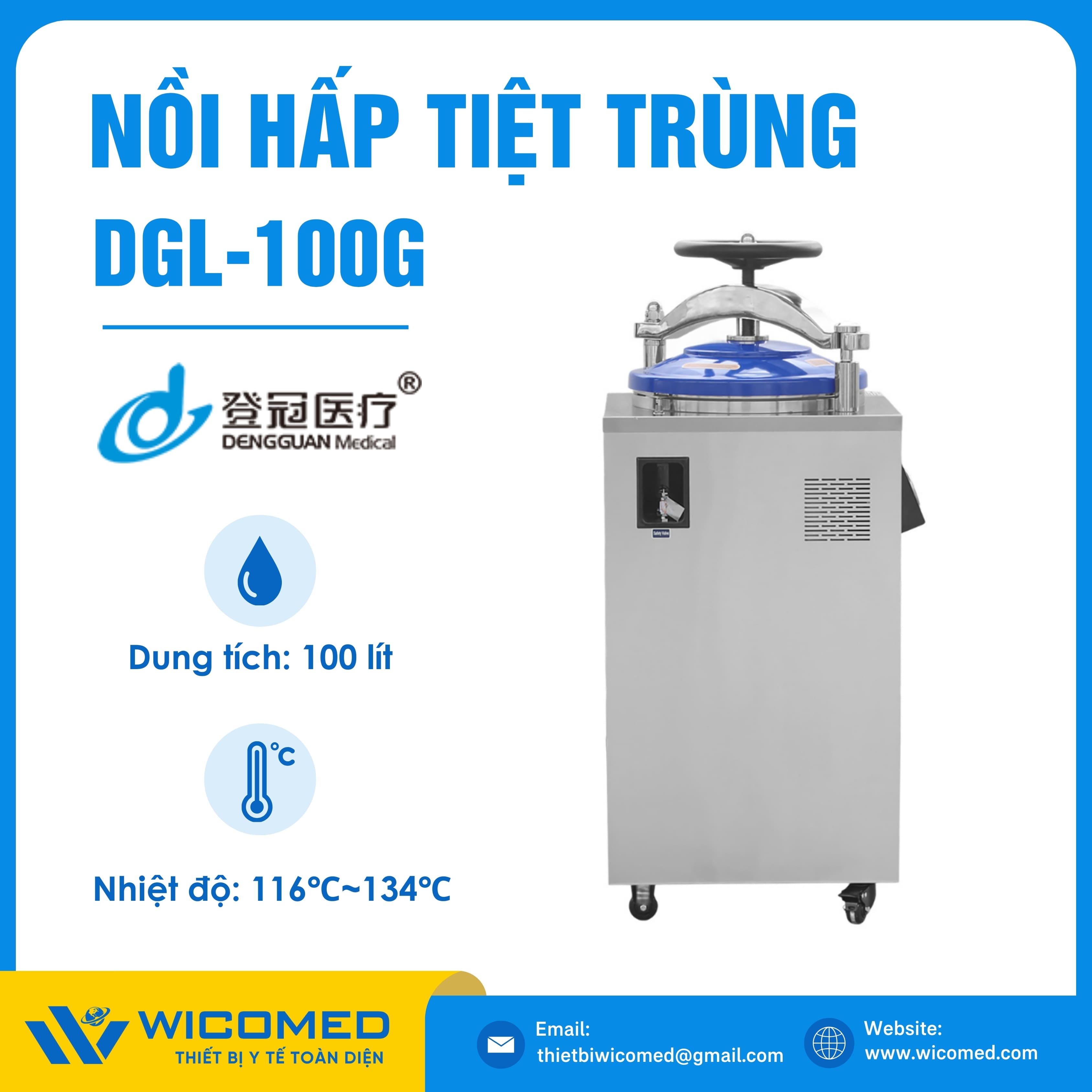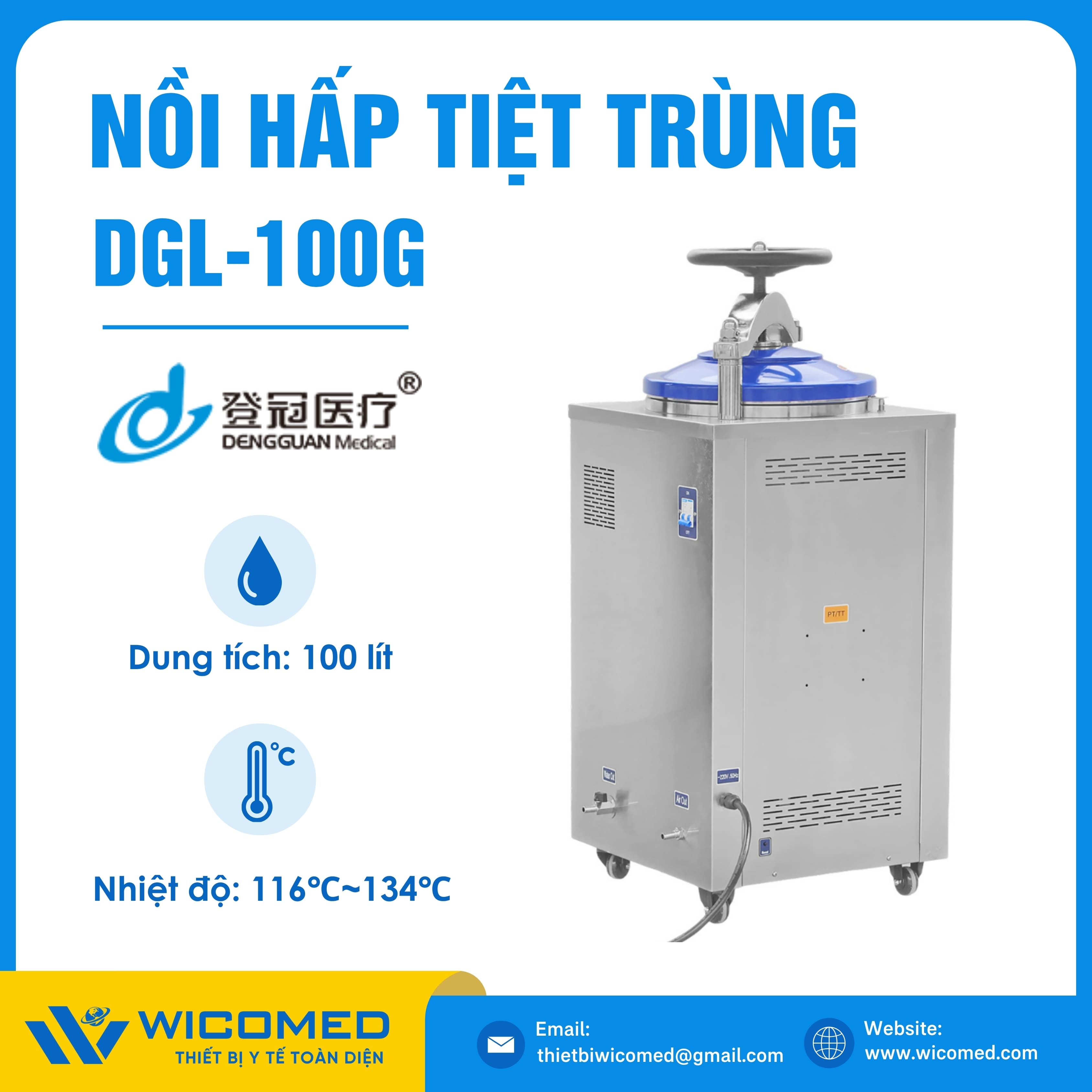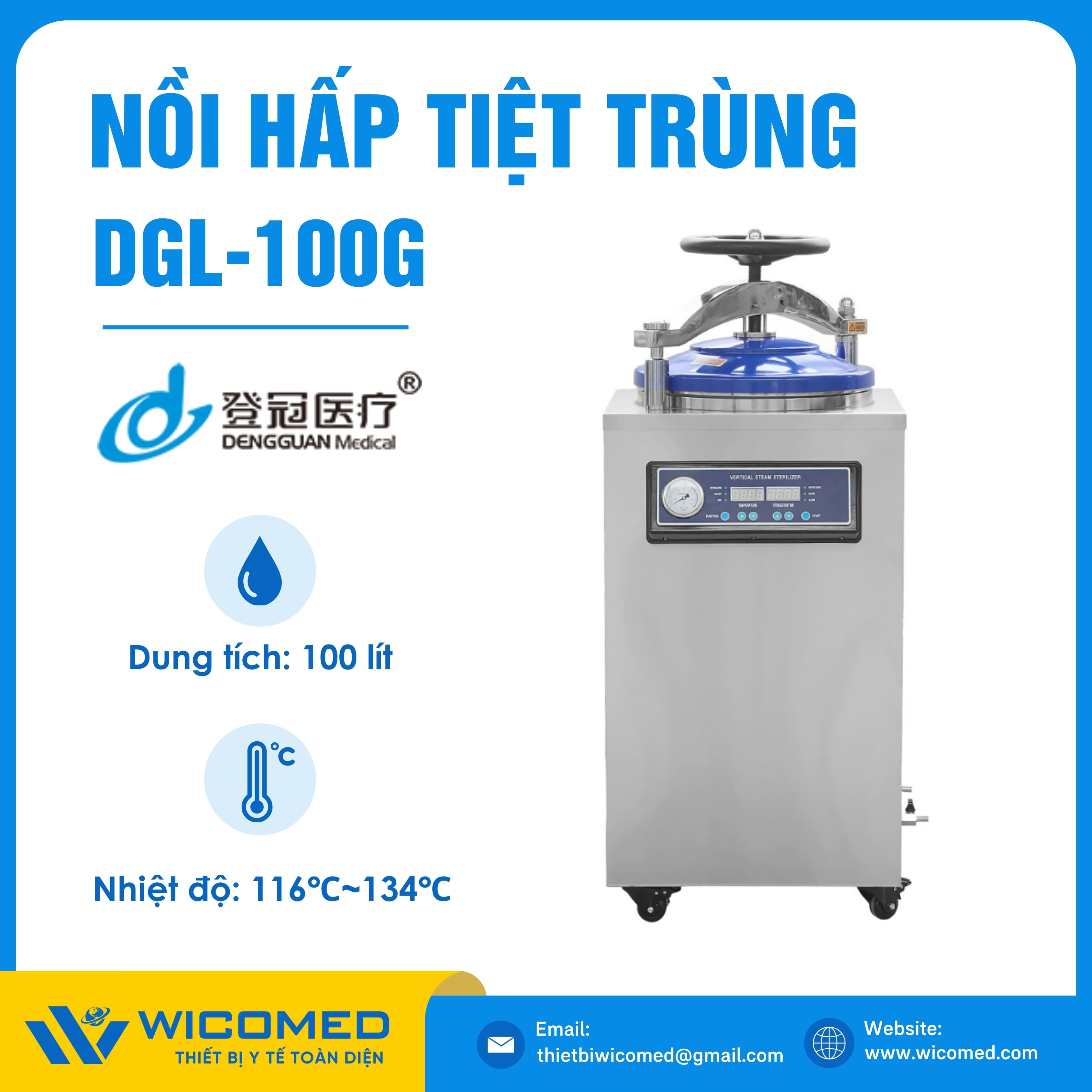 DGL-100G 🌟 Nồi hấp tiệt trùng kiểu đứng có sấy với dung tích 100 Lít, nhiệt độ tiệt trùng tối đa lên tới 134 độ C do hãng Dengguan - Trung Quốc sản xuất. Là thiết bị khử trùng tác nhân gây truyền nhiễm trên dụng cụ, thiết bị y tế, quần áo phẫu thuật,... Ứng dụng rộng rãi trong bệnh viện, phòng khám, trạm y tế,... Được nhập khẩu chính hãng bởi Wicomed. Bảo hành 12 tháng, cung cấp đầy đủ giấy tờ nhập khẩu đem đến uy tín và an tâm cho người sử dụng.