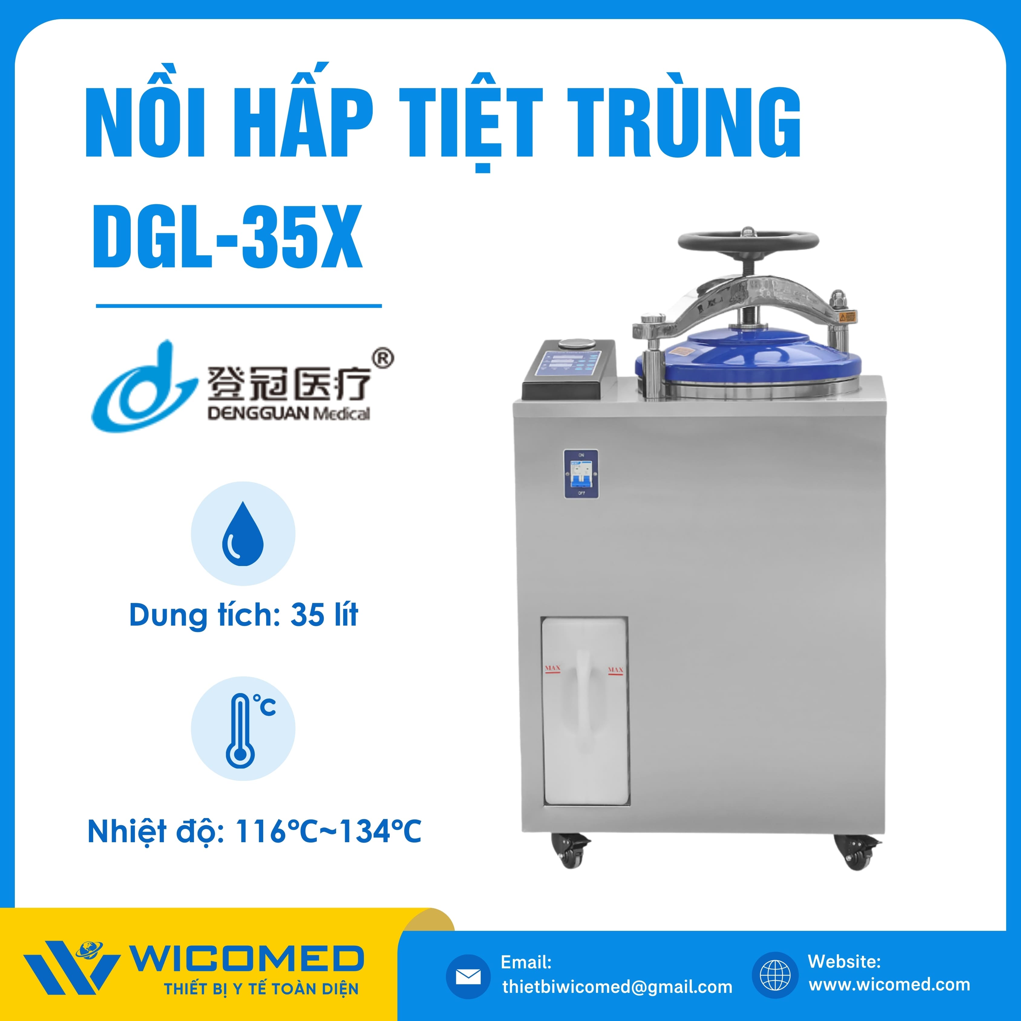 DGL-35X 🌟 Nồi hấp tiệt trùng kiểu đứng có sấy với dung tích 35 Lít, nhiệt độ tiệt trùng tối đa lên tới 134 độ C do hãng Dengguan - Trung Quốc sản xuất. Là thiết bị khử trùng tác nhân gây truyền nhiễm trên dụng cụ, thiết bị y tế, quần áo phẫu thuật,... Ứng dụng rộng rãi trong bệnh viện, phòng khám, trạm y tế,... Được nhập khẩu chính hãng bởi Wicomed. Bảo hành 12 tháng, cung cấp đầy đủ giấy tờ nhập khẩu đem đến uy tín và an tâm cho người sử dụng.