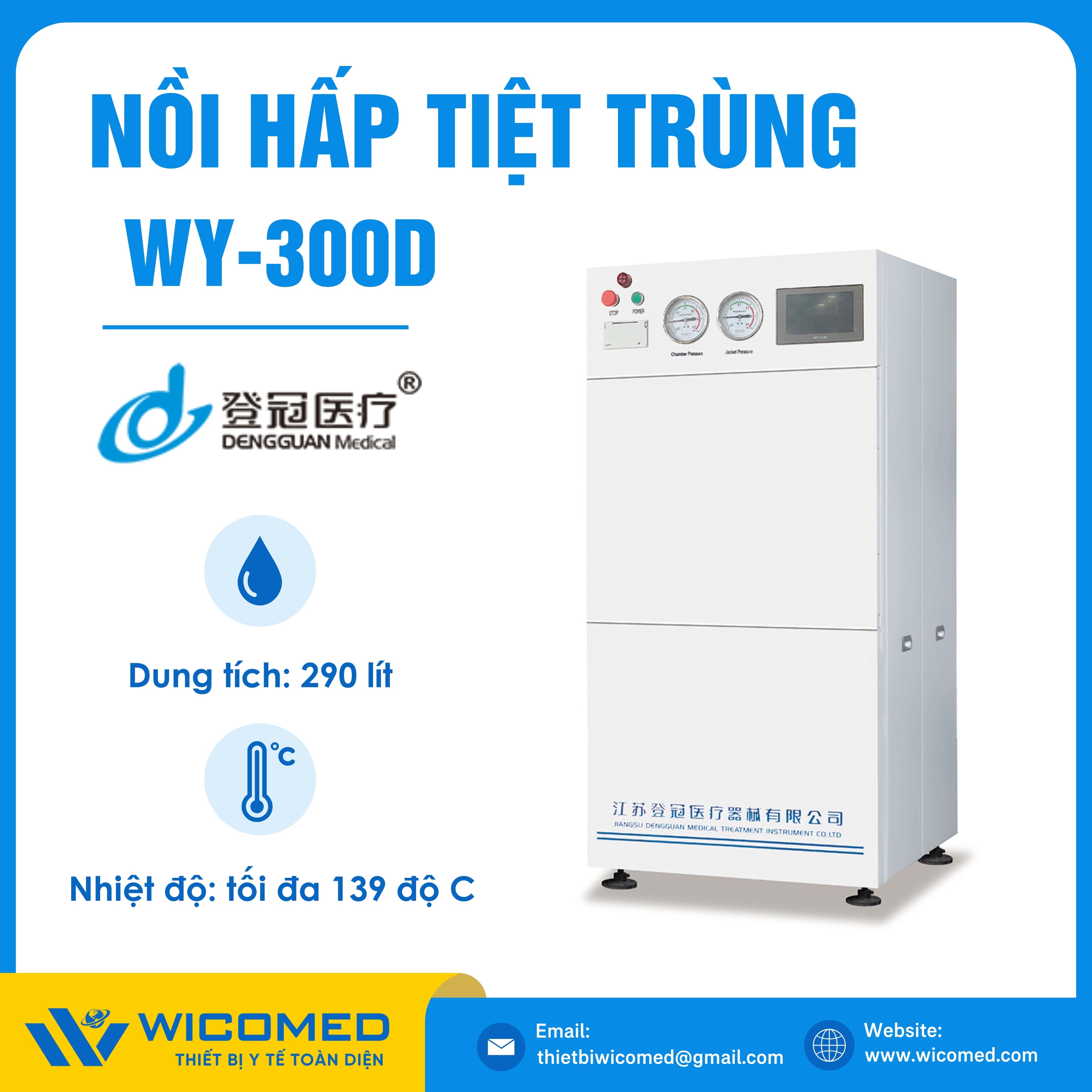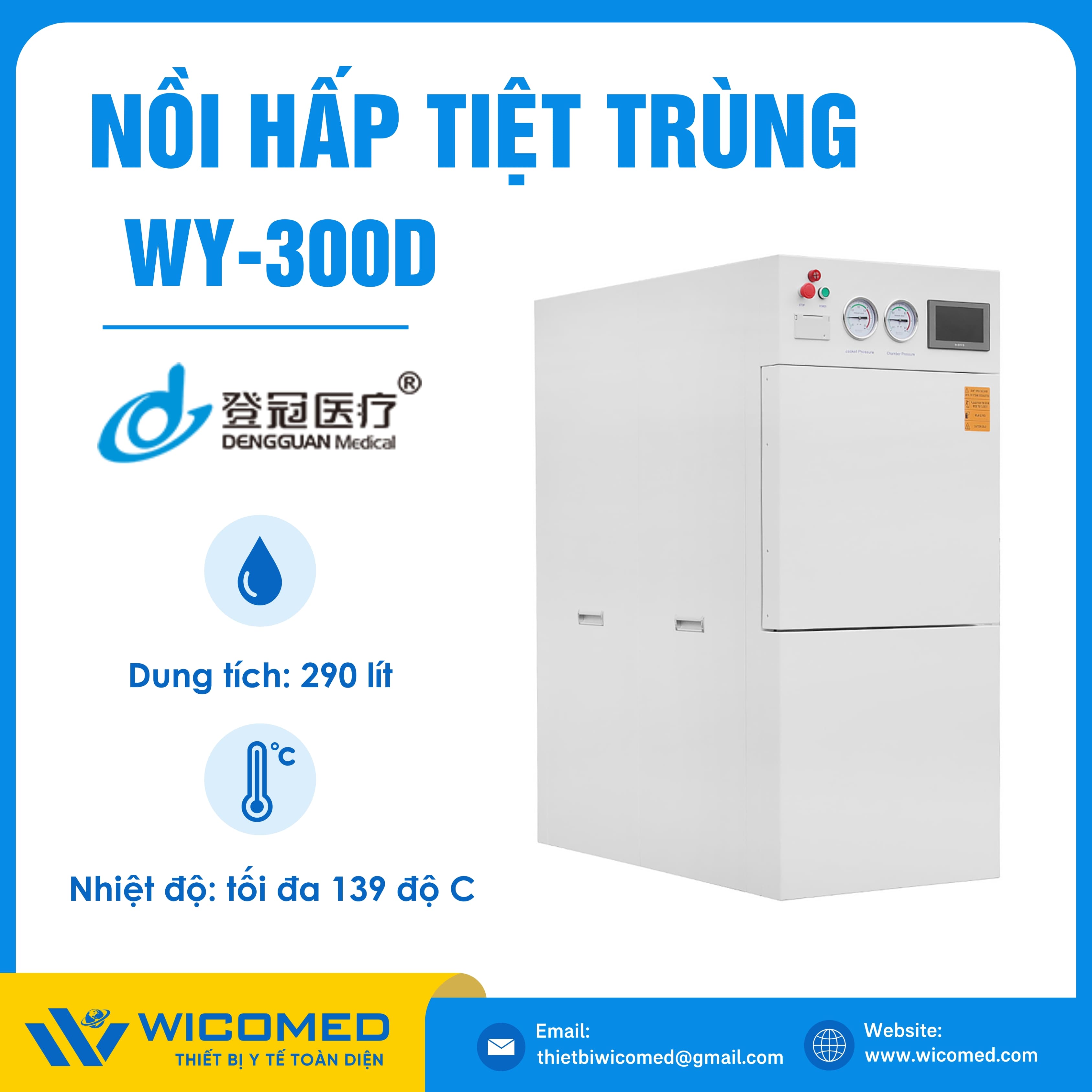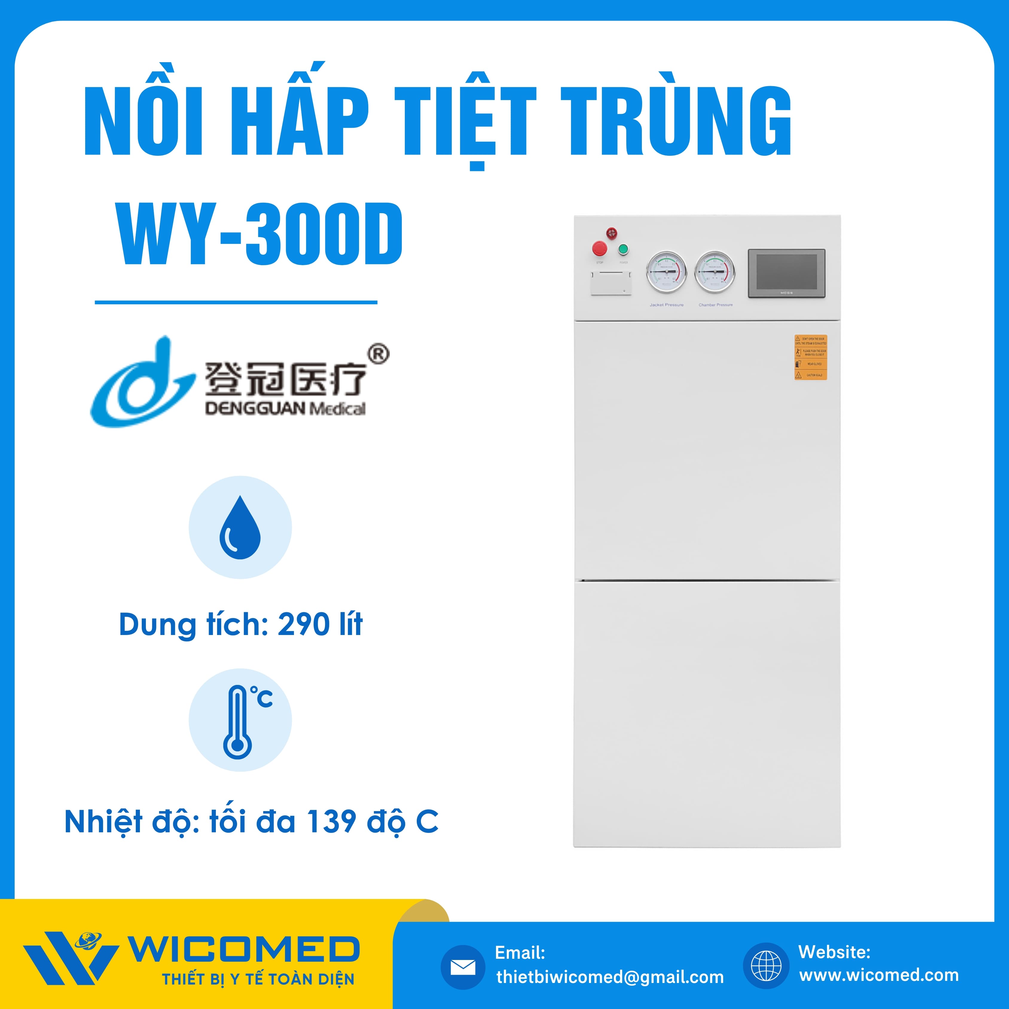 WY-300D 🌟 Nồi hấp tiệt trùng Class N với dung tích 290 Lít, nhiệt độ tiệt trùng tối đa lên tới 138 độ C do hãng Dengguan - Trung Quốc sản xuất. Là thiết bị khử trùng tác nhân gây truyền nhiễm trên dụng cụ, thiết bị y tế, quần áo phẫu thuật,... Ứng dụng rộng rãi trong bệnh viện, phòng khám, trạm y tế,... Được nhập khẩu chính hãng bởi Wicomed. Bảo hành 12 tháng, cung cấp đầy đủ giấy tờ nhập khẩu đem đến uy tín và an tâm cho người sử dụng.