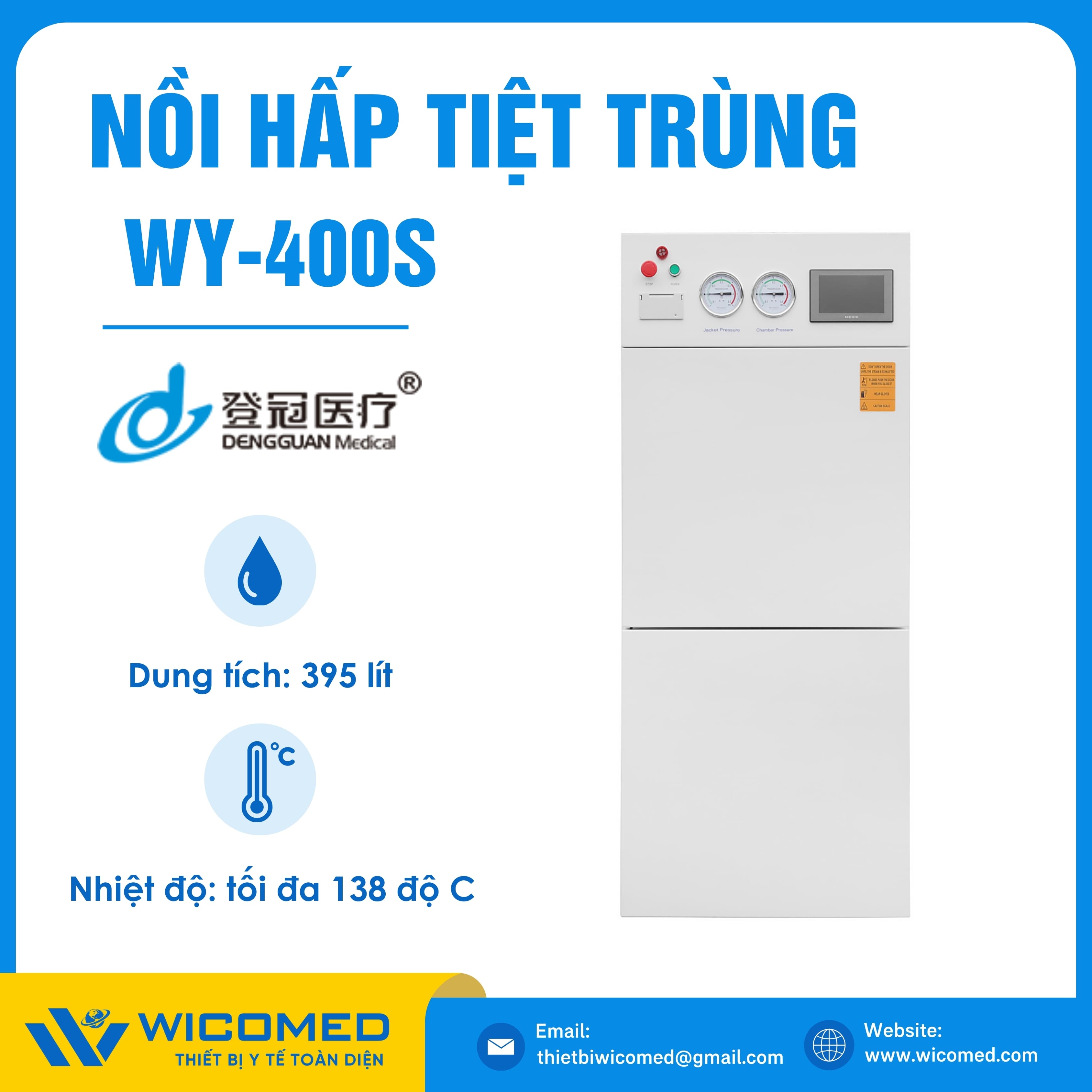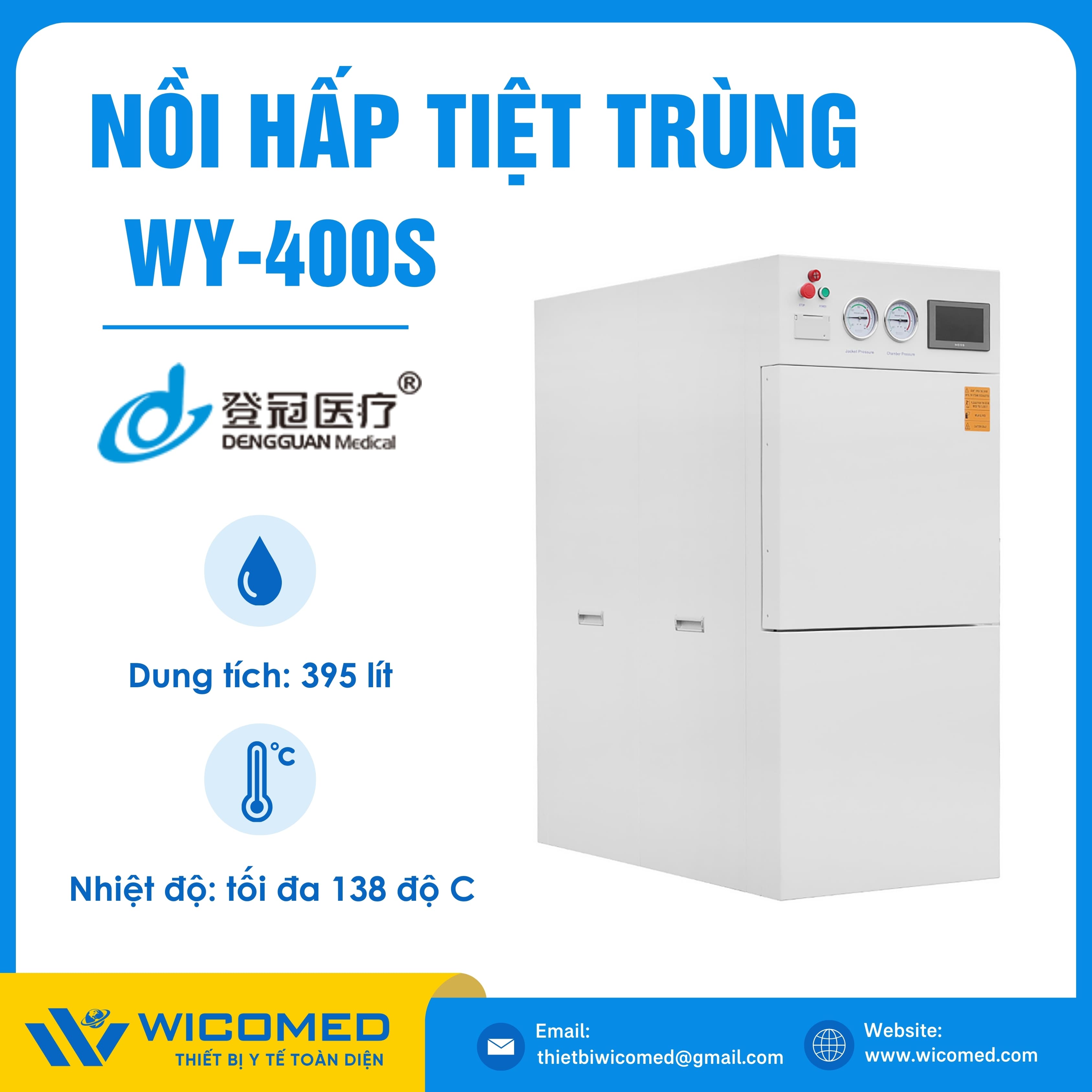 WY-400S 🌟 Nồi hấp tiệt trùng Class N với dung tích 395 Lít, nhiệt độ tiệt trùng tối đa lên tới 138 độ C do hãng Dengguan - Trung Quốc sản xuất. Là thiết bị khử trùng tác nhân gây truyền nhiễm trên dụng cụ, thiết bị y tế, quần áo phẫu thuật,... Ứng dụng rộng rãi trong bệnh viện, phòng khám, trạm y tế,... Được nhập khẩu chính hãng bởi Wicomed. Bảo hành 12 tháng, cung cấp đầy đủ giấy tờ nhập khẩu đem đến uy tín và an tâm cho người sử dụng.