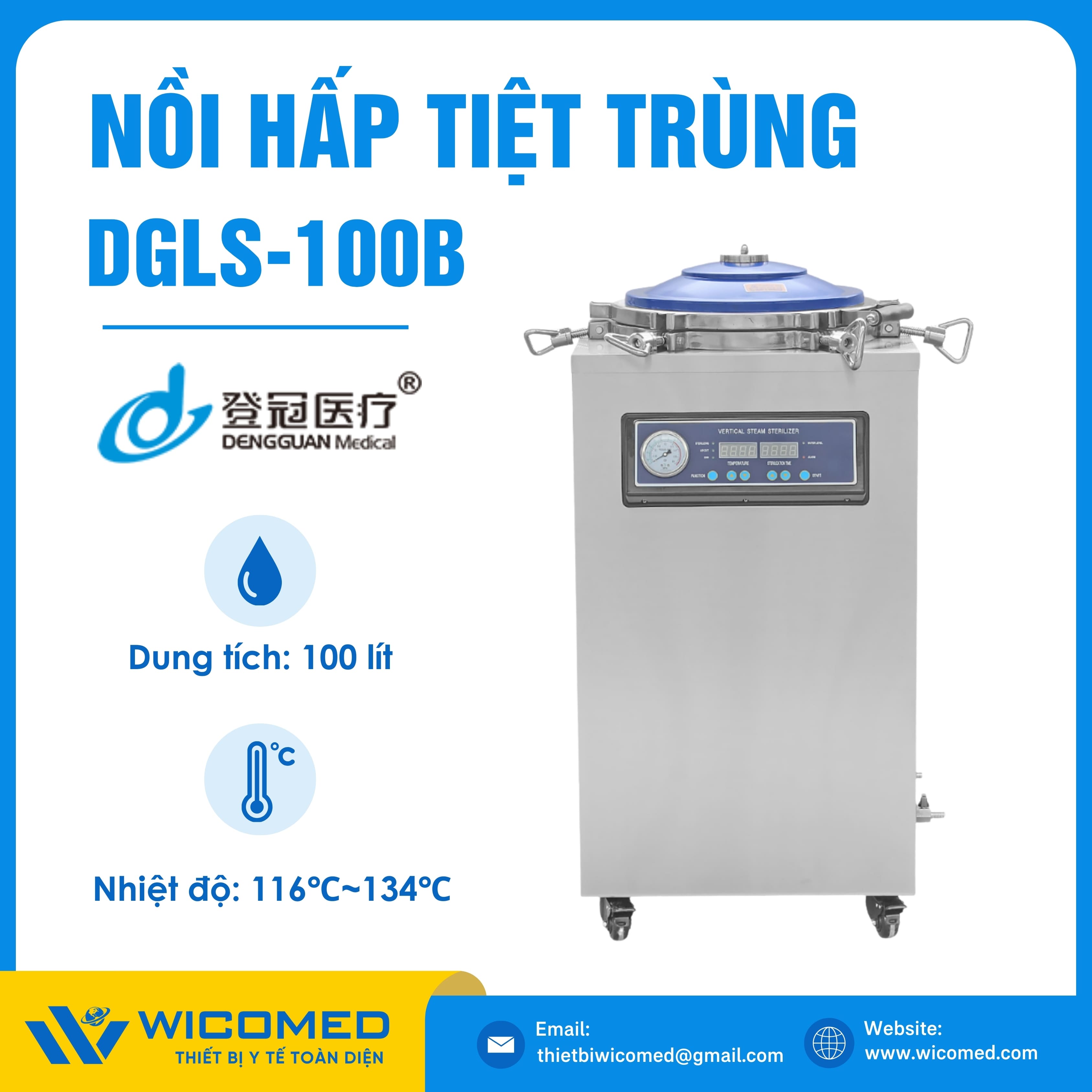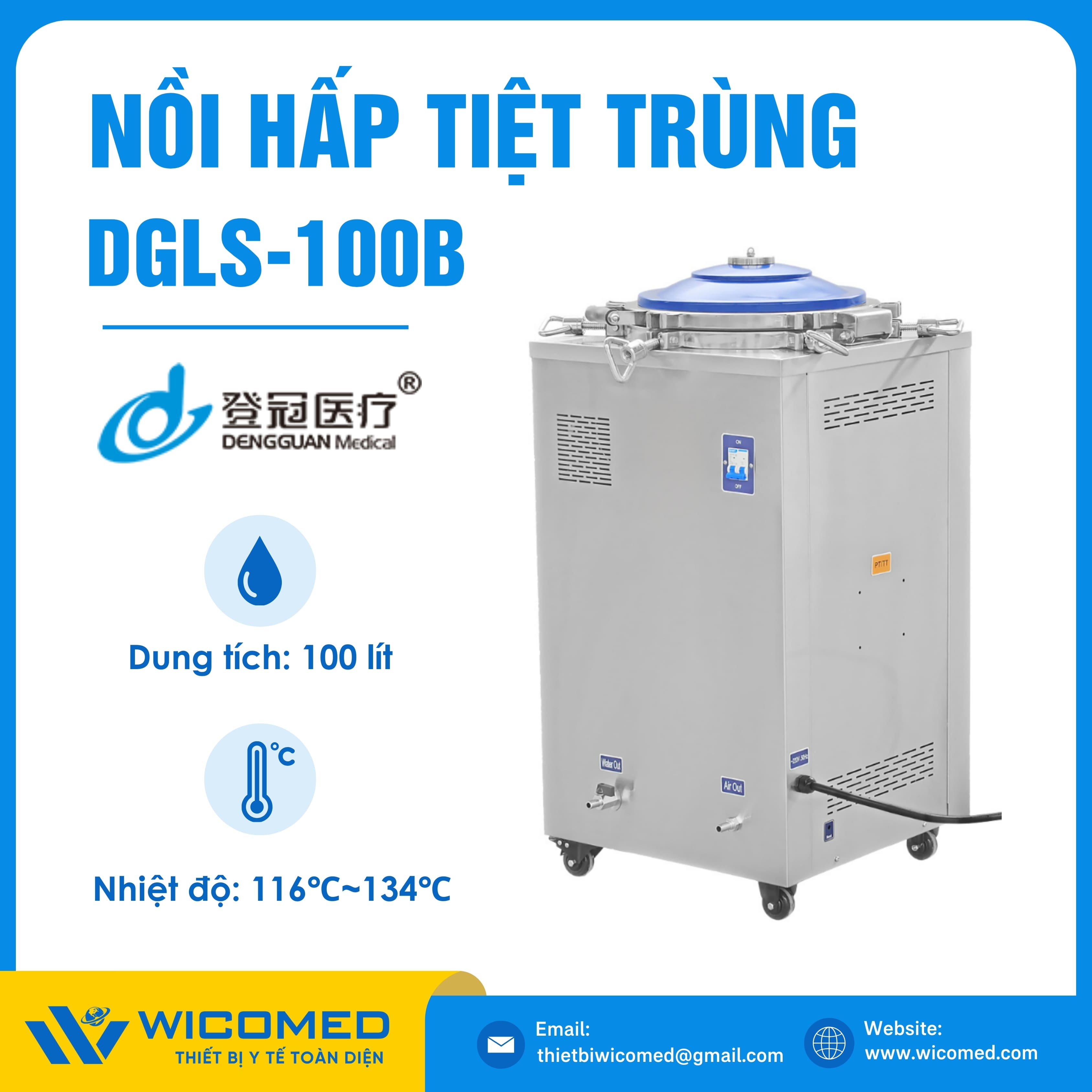 DGLS-100B 🌟 Nồi hấp tiệt trùng kiểu đứng với dung tích 100 Lít, nhiệt độ tiệt trùng tối đa lên tới 134 độ C do hãng Dengguan - Trung Quốc sản xuất. Là thiết bị khử trùng tác nhân gây truyền nhiễm trên dụng cụ, thiết bị y tế, quần áo phẫu thuật,... Ứng dụng rộng rãi trong bệnh viện, phòng khám, trạm y tế,... Được nhập khẩu chính hãng bởi Wicomed. Bảo hành 12 tháng, cung cấp đầy đủ giấy tờ nhập khẩu đem đến uy tín và an tâm cho người sử dụng.