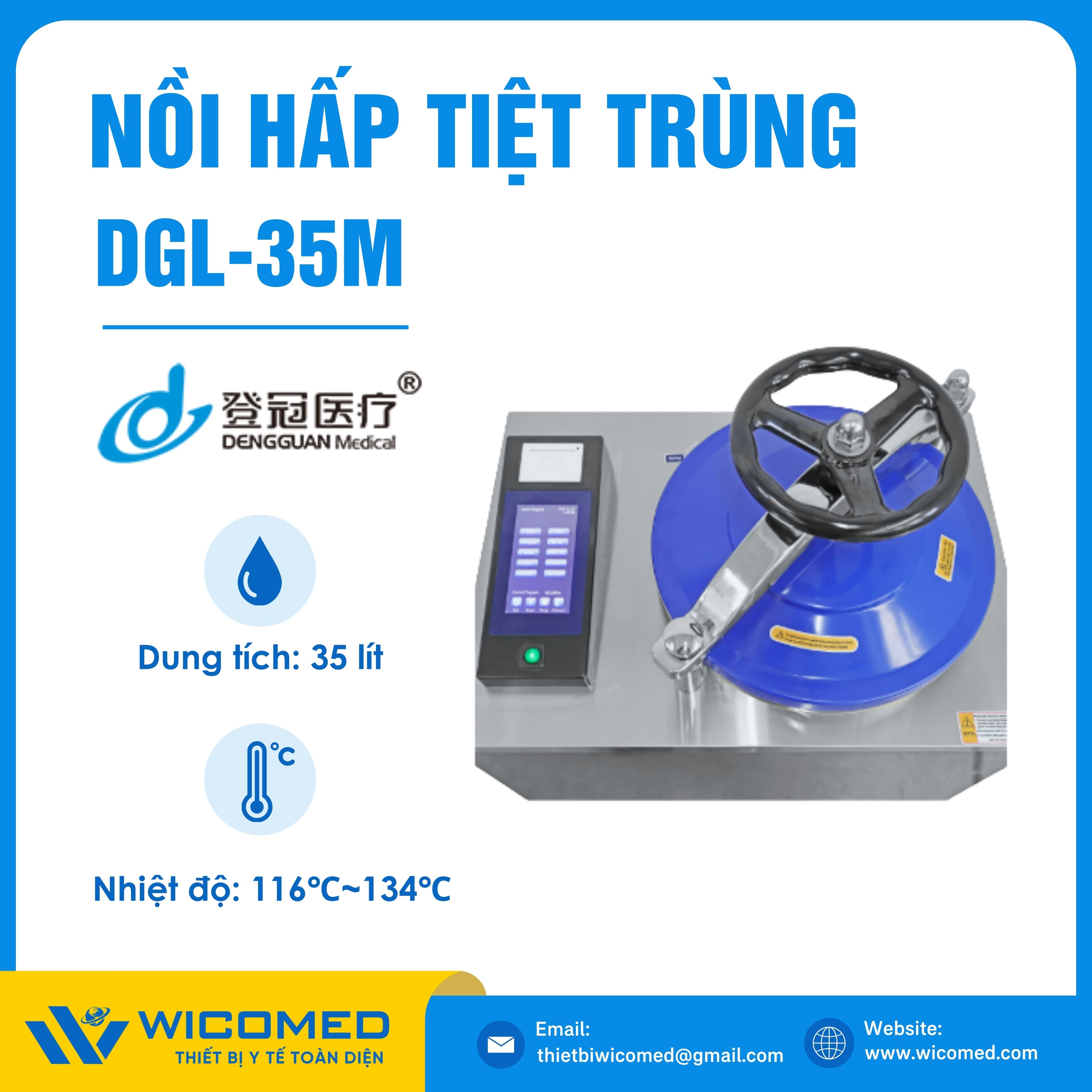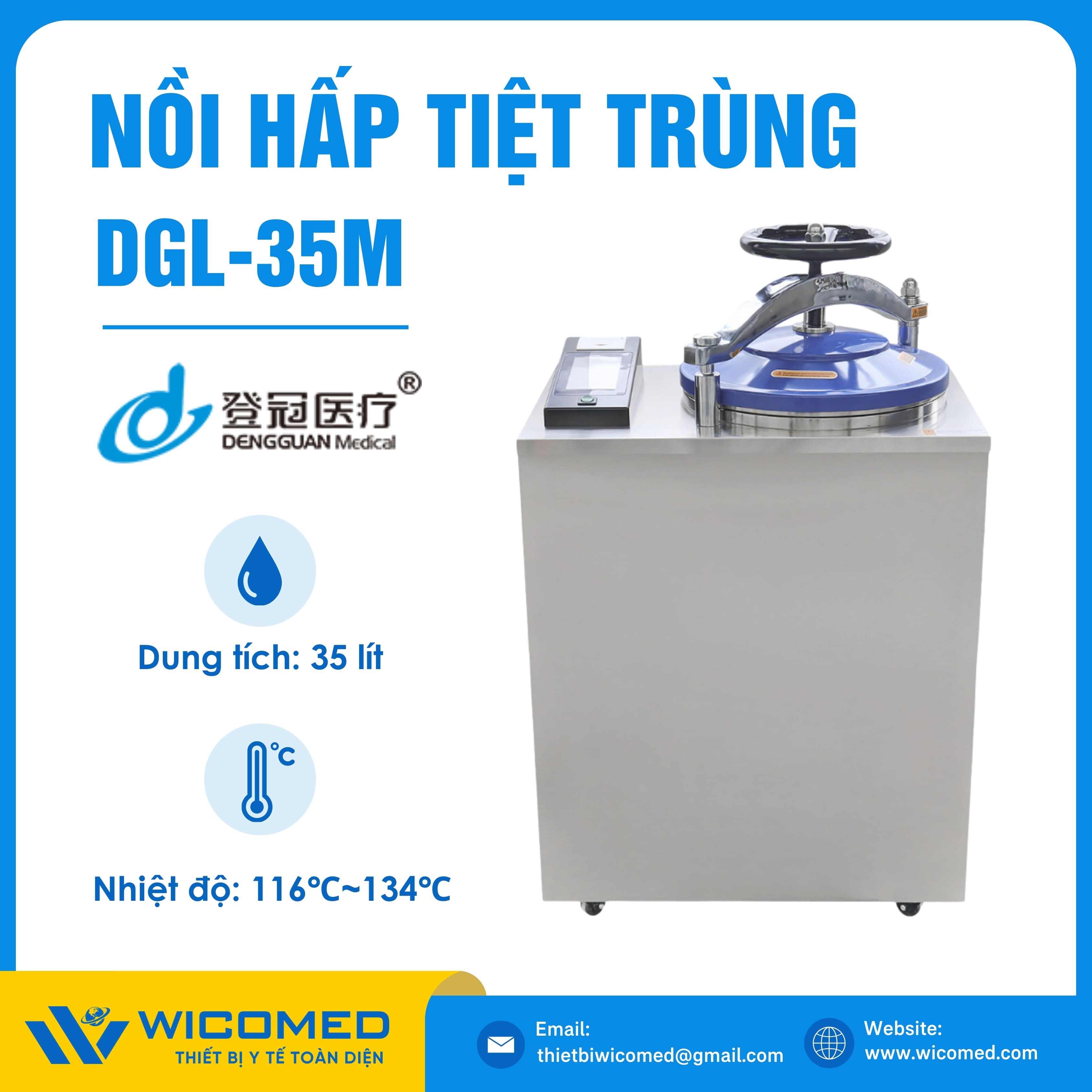 DGL-35M 🌟 Nồi hấp tiệt trùng kiểu đứng sấy chân không với dung tích 35 Lít, nhiệt độ tiệt trùng tối đa lên tới 134 độ C do hãng Dengguan - Trung Quốc sản xuất. Là thiết bị khử trùng tác nhân gây truyền nhiễm trên dụng cụ, thiết bị y tế, quần áo phẫu thuật,... Ứng dụng rộng rãi trong bệnh viện, phòng khám, trạm y tế,... Được nhập khẩu chính hãng bởi Wicomed. Bảo hành 12 tháng, cung cấp đầy đủ giấy tờ nhập khẩu đem đến uy tín và an tâm cho người sử dụng.