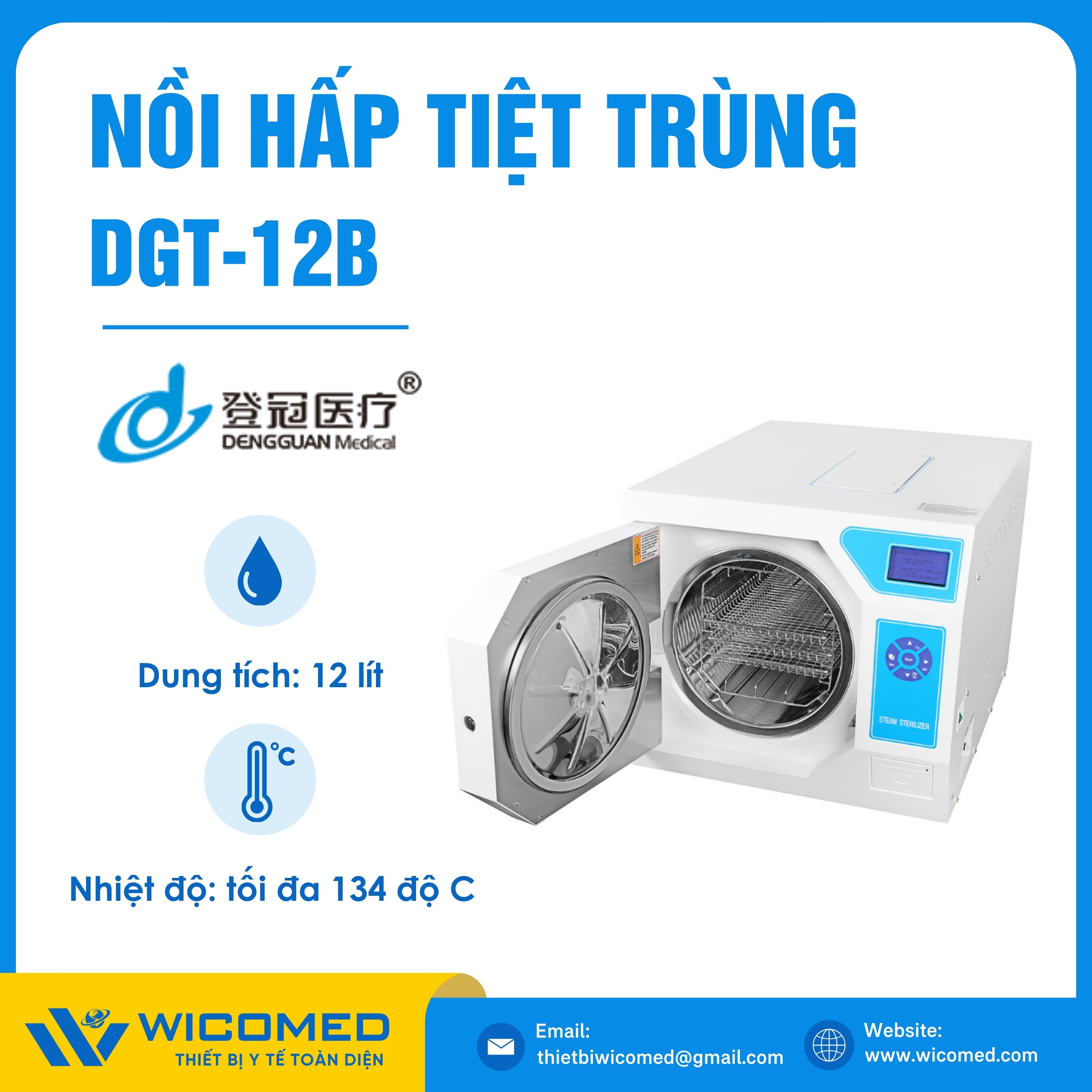 DGT-12B 🌟 Nồi hấp tiệt trùng sấy chân không chuẩn Class B với dung tích 12 Lít, nhiệt độ tiệt trùng tối đa lên tới 134 độ C do hãng Dengguan - Trung Quốc sản xuất. Là thiết bị khử trùng tác nhân gây truyền nhiễm trên dụng cụ, thiết bị y tế, quần áo phẫu thuật,... Ứng dụng rộng rãi trong bệnh viện, phòng khám, trạm y tế,... Được nhập khẩu chính hãng bởi Wicomed. Bảo hành 12 tháng, cung cấp đầy đủ giấy tờ nhập khẩu đem đến uy tín và an tâm cho người sử dụng.