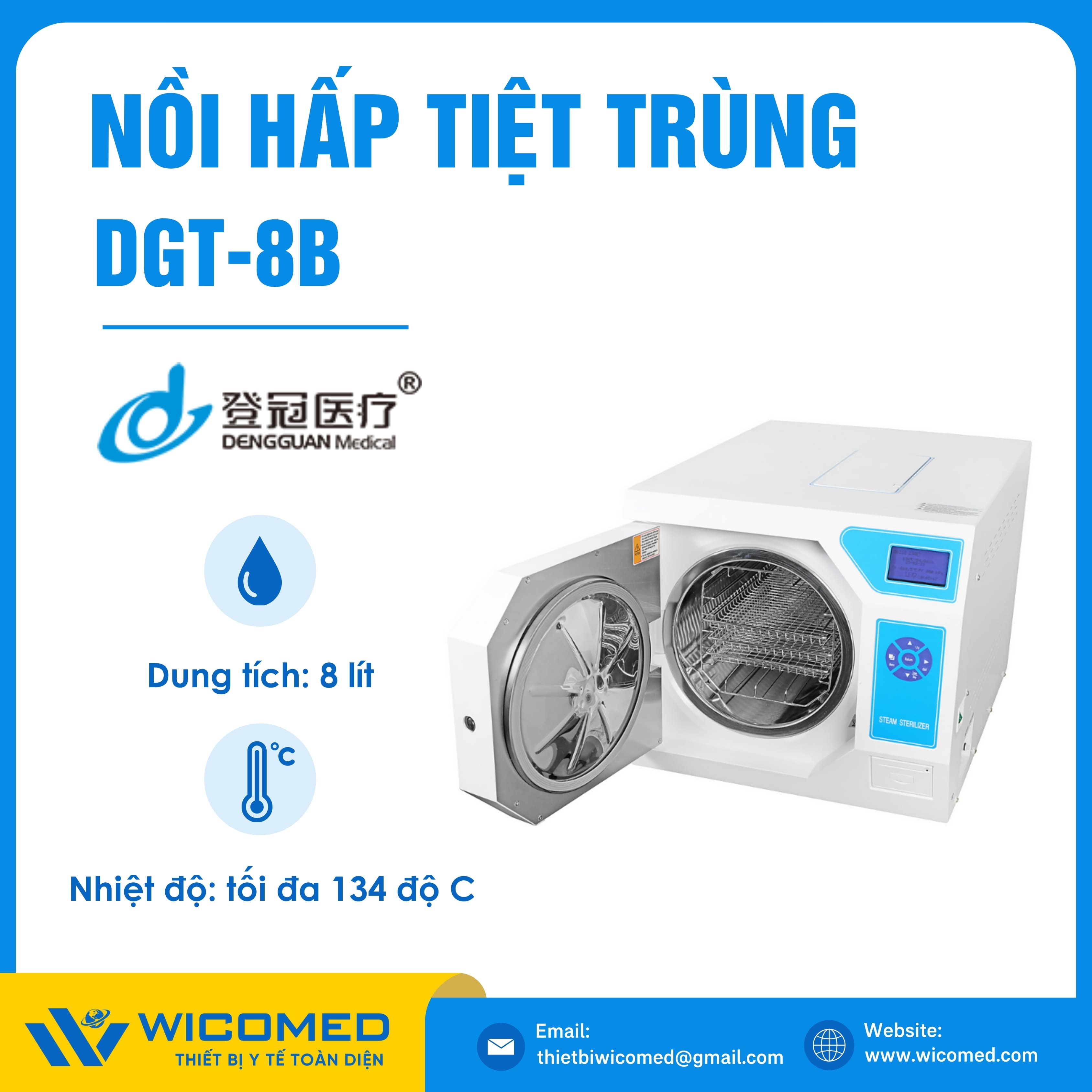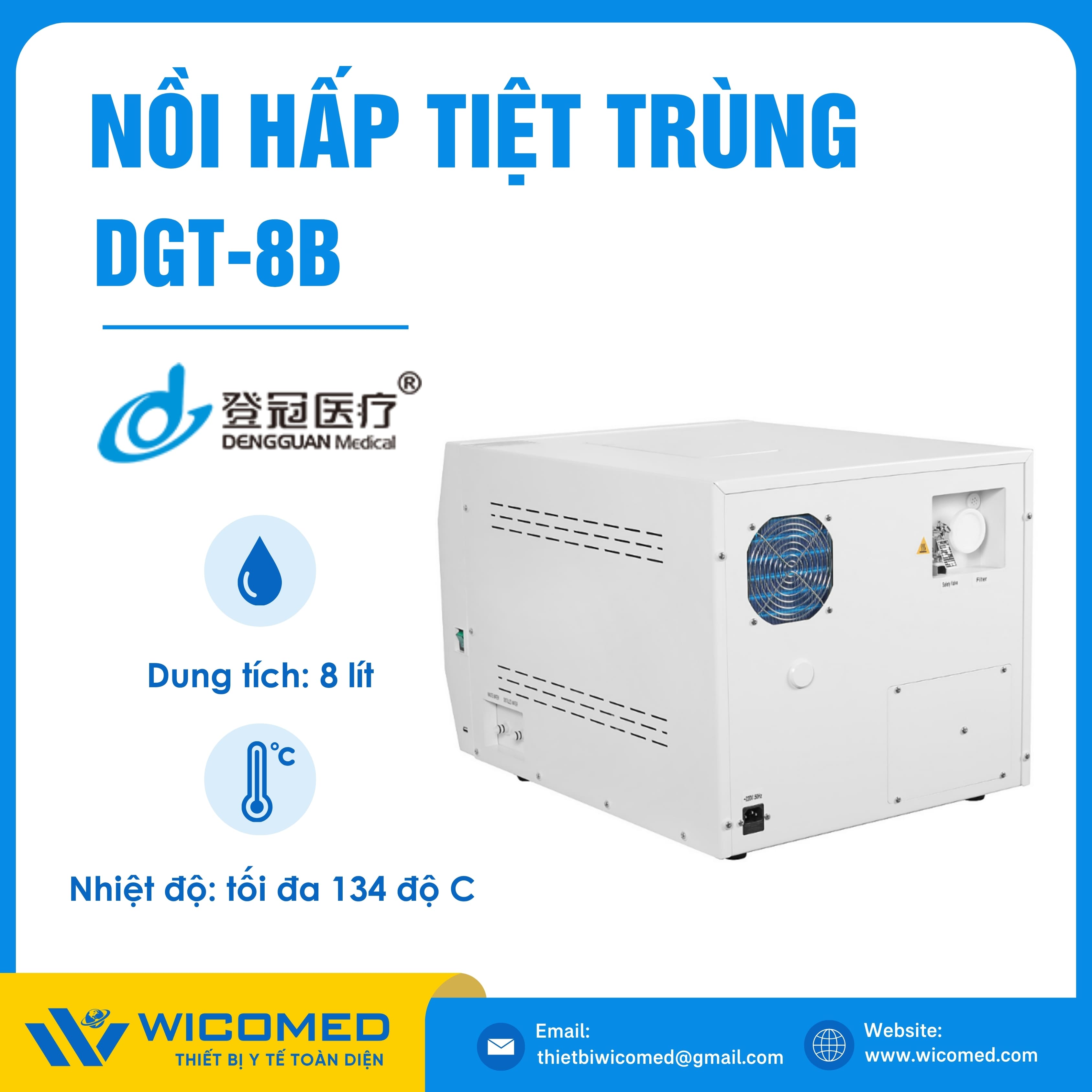 DGT-8B 🌟 Nồi hấp tiệt trùng sấy chân không chuẩn Class B với dung tích 8 Lít, nhiệt độ tiệt trùng tối đa lên tới 134 độ C do hãng Dengguan - Trung Quốc sản xuất. Là thiết bị khử trùng tác nhân gây truyền nhiễm trên dụng cụ, thiết bị y tế, quần áo phẫu thuật,... Ứng dụng rộng rãi trong bệnh viện, phòng khám, trạm y tế,... Được nhập khẩu chính hãng bởi Wicomed. Bảo hành 12 tháng, cung cấp đầy đủ giấy tờ nhập khẩu đem đến uy tín và an tâm cho người sử dụng.