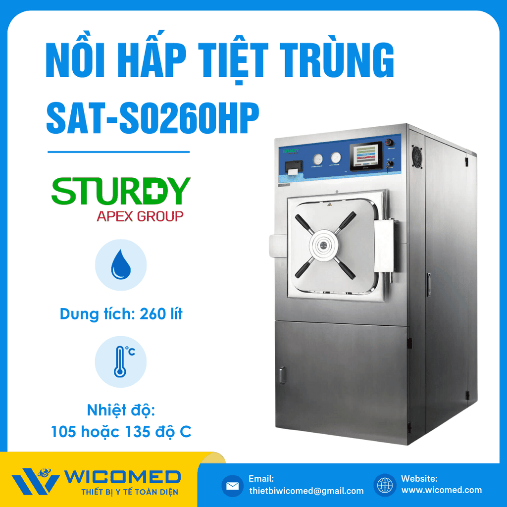 SAT-S0260HP 🌟 Nồi hấp tiệt trùng buồng hấp vuông 260 lít, được hãng Sturdy thiết kế theo kiểu tủ đứng dễ dàng thao tác. Bộ điều khiển PLC màn hình HMI, tính năng tạo chân không trước quá trình tiệt trùng và sấy khô bằng chân không sau quá trình tiệt trùng. Tùy chỉnh các chế độ: hút chân không trước khi hấp/ nhiệt độ tiệt trùng/ thời gian tiệt trùng / xả / thời gian sấy. Được nhập khẩu chính hãng bởi Wicomed