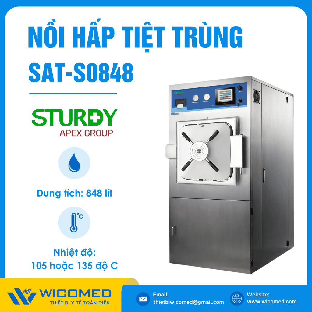 SAT-S0848 Là nồi hấp tiệt trùng buồng hấp vuông dung tích 848 lít, được hãng Sturdy - Đài Loan thiết kế theo kiểu tủ đứng dễ dàng thao tác. Nồi được sản xuất theo tiêu chuẩn 93/42 / EEC, Class IIB, EN 61010-1 / -2-040, ...Bộ điều khiển kỹ thuật số, tính năng tạo chân không trước quá trình tiệt trùng và sấy khô bằng chân không sau quá trình tiệt trùng. Được nhập khẩu chính hãng bởi Wicomed. Bảo hành 12 tháng, cung cấp đầy đủ giấy tờ nhập khẩu đem đến uy tín và an tâm cho người sử dụng.