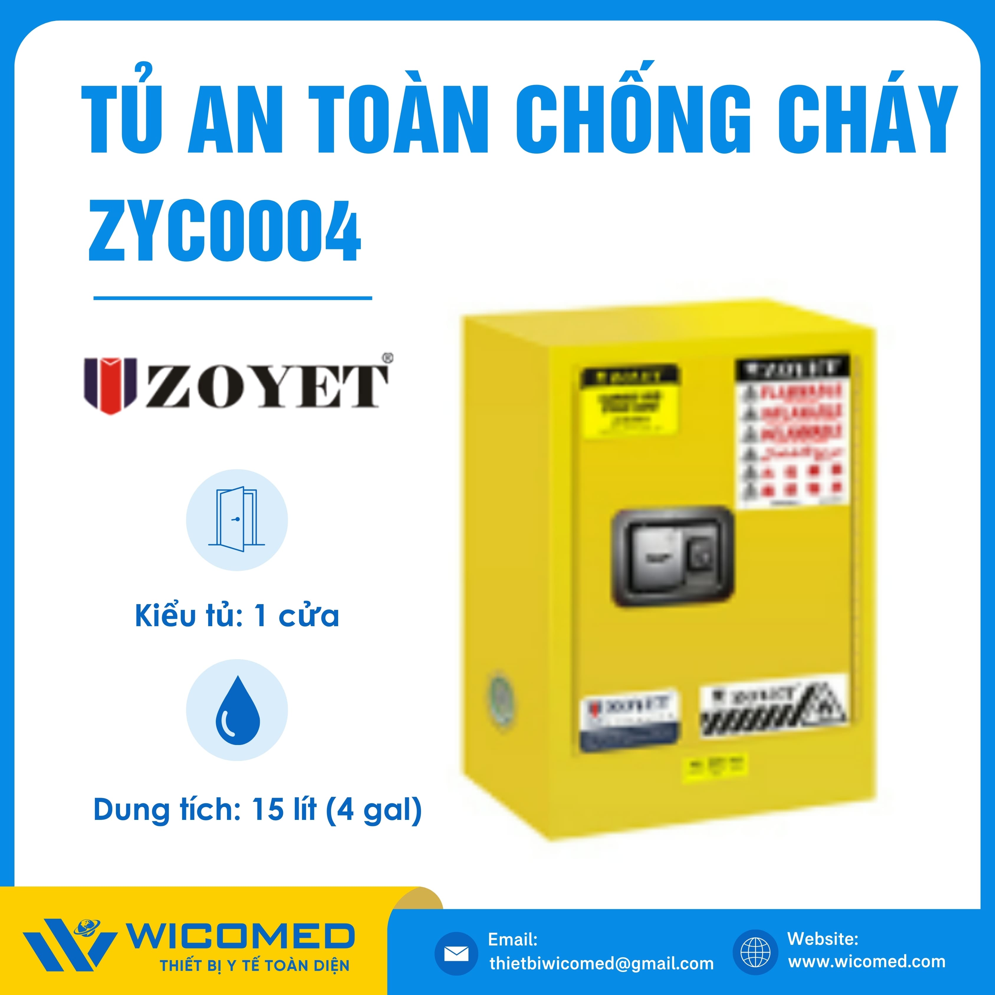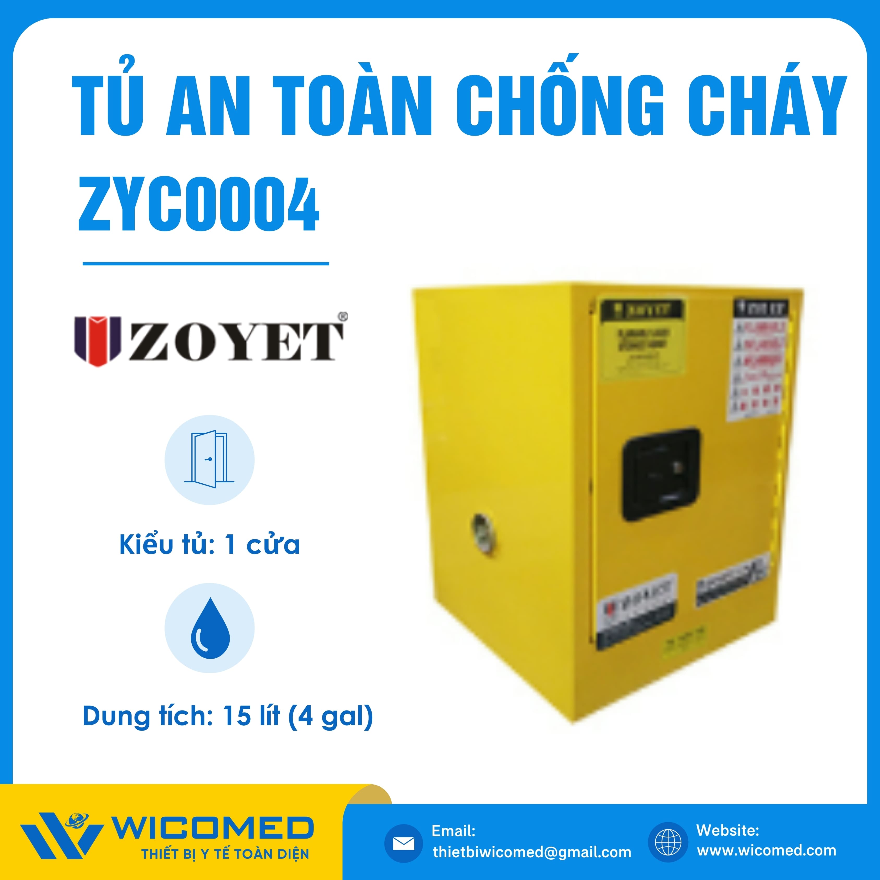 ZYC0004 🌟 Tủ an toàn chống cháy 1 cửa với dung tích 15 lít (4 gal) do hãng Zoyet - Trung Quốc sản xuất. Là thiết bị chuyên dụng để lưu trữ các chất dễ cháy, dễ nổ, độc hại hoặc các vật phẩm có giá trị cao, đảm bảo mang lại sự bảo vệ an toàn ở mức cao nhất. Được nhập khẩu chính hãng bởi Wicomed. Bảo hành 12 tháng, cung cấp đầy đủ giấy tờ nhập khẩu đem đến uy tín và an tâm cho người sử dụng.