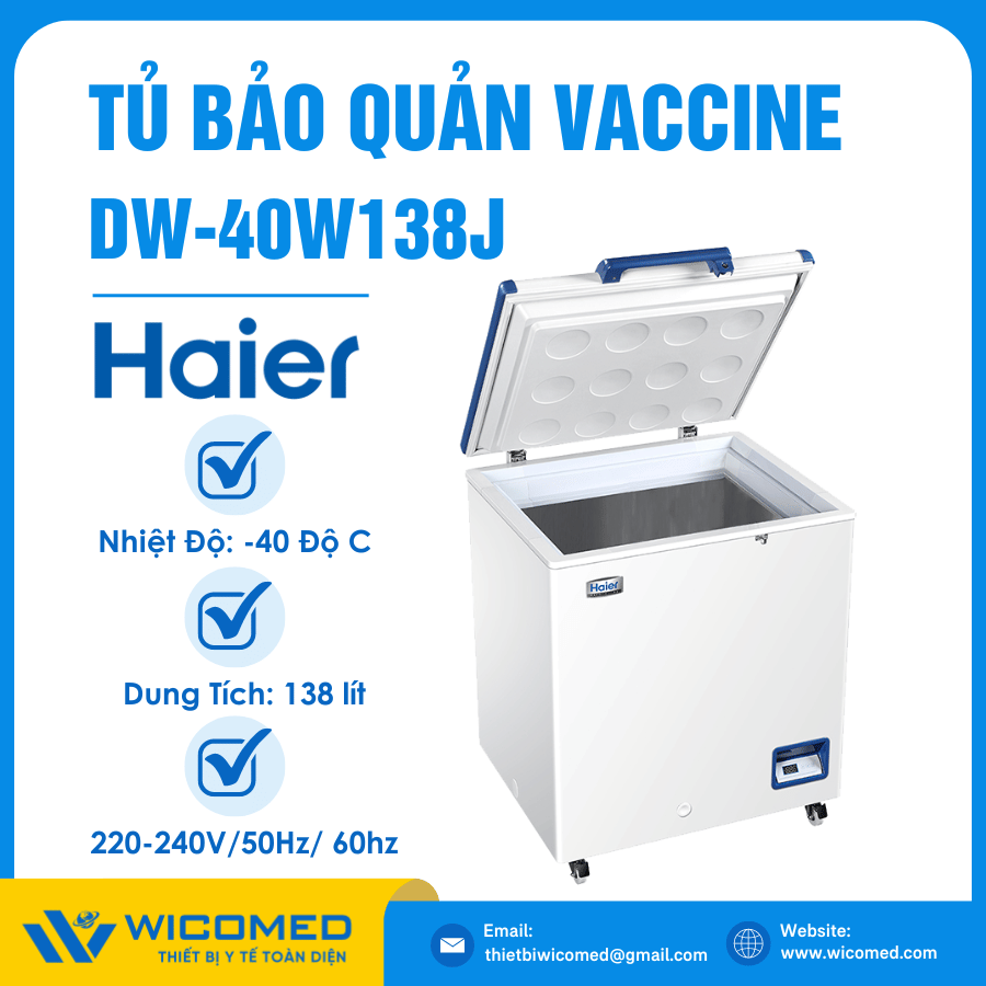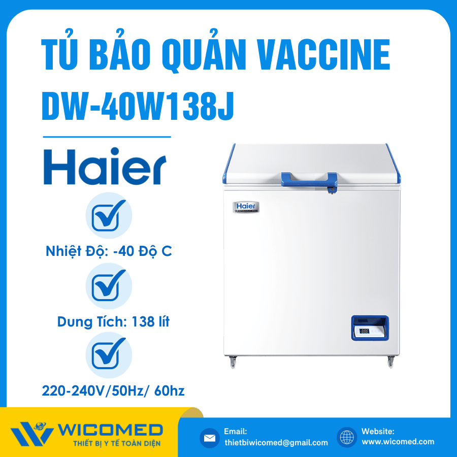Tủ DW-40W138J ⭐ tủ bảo quản do hãng Haier BioMedical (đạt tiêu chuẩn WHO, GPM, ISO, CE...) thiết kế và chế tạo. Với dung tích 138 lít, thiết kể kiểu tủ ngang, cửa trên dễ dàng sử dụng. Dải nhiệt độ có thể điều chỉnh từ -20~ -40 độ C. Được nhập khẩu chính hãng bởi Wicomed. Bảo hành 12 tháng, cung cấp đầy đủ giấy tờ nhập khẩu đem đến uy tín và an tâm cho người sử dụng.